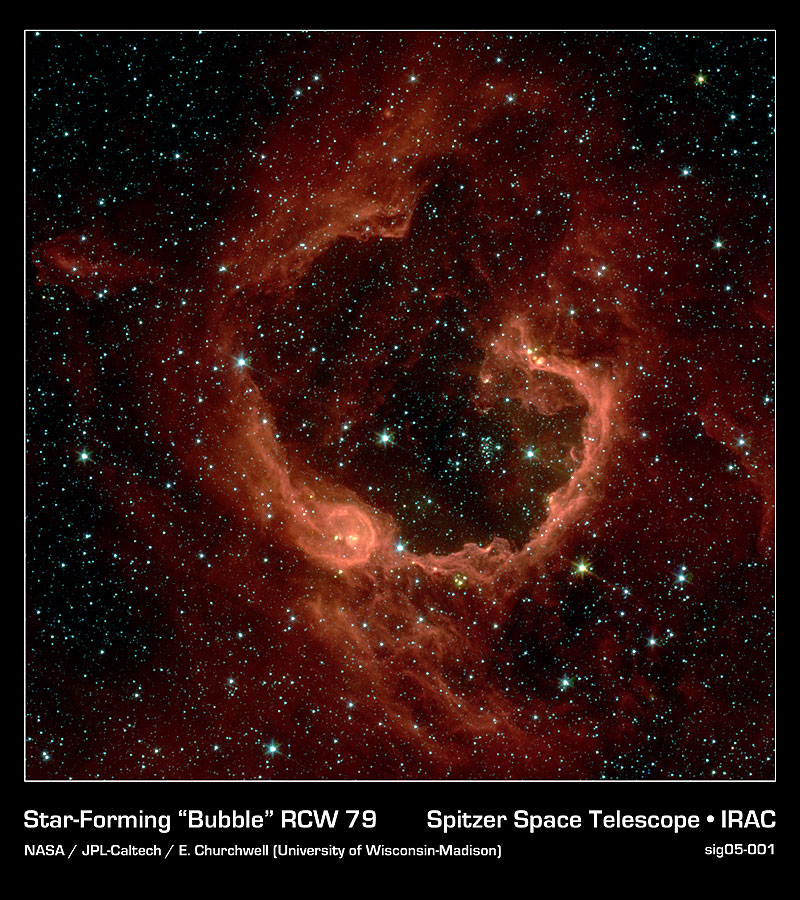 RCW 79 es una burbuja cósmica de gas y polvo que ha alcanzado un diámetro de aproximadamente 70 años luz, expandida por los vientos y la radiación de estrellas jóvenes calientes. La luz infrarroja del polvo incrustado en la nebulosa aparece teñida de rojo en esta magnífica imagen en falso color del Telescopio Espacial Spitzer. Ubicada a unos 17 mil años luz de distancia en la magnífica constelación austral del Centauro, la nebulosa en expansión ha desencadenado la formación de estrellas conforme se abre paso a través del gas y el polvo que la rodea. De hecho, esta penetrante imagen infrarroja revela grupos de estrellas nuevas como puntos amarillentos dispersos a lo largo del borde de la burbuja. Un grupo notable aún se encuentra dentro de su propia burbuja natal aproximadamente a las 7 en punto (abajo a la izquierda), mientras que otro puede verse cerca de la brecha superior aproximadamente a las 3 en punto (derecha) desde el centro de la burbuja.
