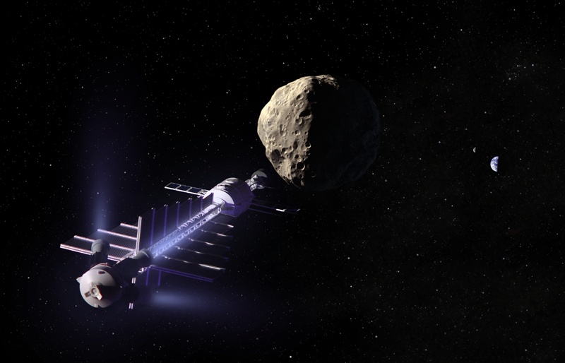 ¿Cómo se podría cambiar la trayectoria de un asteroide que amenace la Tierra? Una idea —una nave espacial masiva que utiliza la gravedad como cable de remolque— se ilustra en esta dramática representación artística de un remolcador gravitatorio en acción. En el escenario hipotético elaborado por Edward Lu y Stanley Love en el Centro Espacial Johnson de la NASA, una nave nuclear-eléctrica de 20 toneladas remolca un asteroide de 200 metros de diámetro simplemente permaneciendo cerca del asteroide. Los propulsores de impulso iónico de la nave están orientados alejados de la superficie. El empuje constante alteraría gradual y predeciblemente la trayectoria del remolcador y el asteroide, acoplados por su atracción gravitatoria mutua. Aunque suena como ciencia ficción, los impulsos iónicos ya propulsan naves espaciales existentes y un remolcador gravitatorio funcionaría independientemente de la estructura del asteroide o sus propiedades superficiales.