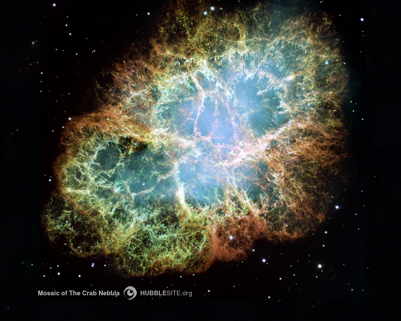 The Crab Nebula is cataloged as M1, the first object on Charles Messier's famous list of things which are not comets. In fact, the cosmic Crab is now known to be a supernova remnant, an expanding cloud of debris from the death explosion of a massive star. Light from that stellar catastrophe was first witnessed by astronomers on planet Earth in the year 1054. Composed of 24 exposures taken in October 1999, January 2000, and December 2000, this Hubble Space Telescope mosaic spans about twelve light years. Colors in the intricate filaments trace the light emitted from atoms of hydrogen, oxygen, and sulfur in the debris cloud. The spooky blue interior glow is emitted by high-energy electrons accelerated by the Crab's central pulsar. One of the most exotic objects known to modern astronomers, the pulsar is a neutron star, the spinning remnant of the collapsed stellar core. The Crab Nebula lies about 6,500 light-years away in the constellation Taurus.