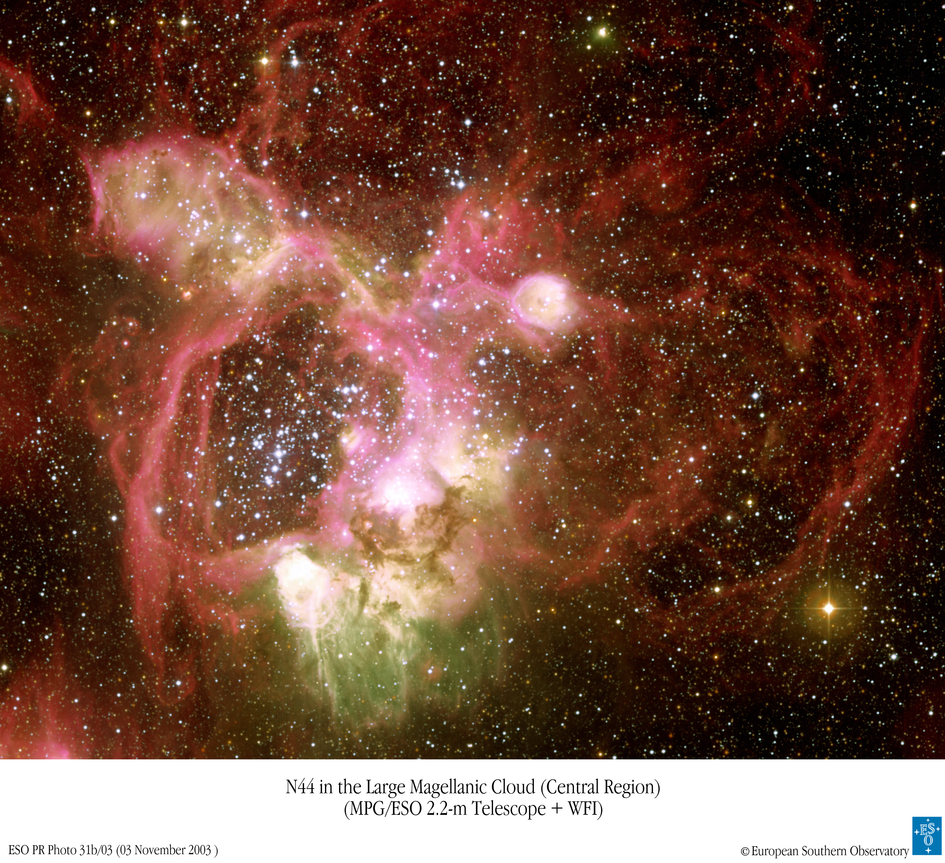 N44 es una de las nebulosas más grandes e intrincadas en esta región del universo. Ubicada en nuestra vecina galáctica, la Gran Nube de Magallanes, N44 alberga numerosas estrellas masivas y brillantes, extensos carriles de polvo oscuro y vastas nubes de gas de hidrógeno que brillan en rojo. El color rojo de la nebulosa de emisión N44 proviene de átomos de hidrógeno omnipresentes que están recapturando electrones que fueron arrancados por la luz energética de estrellas masivas. Las estrellas centrales también parecen haber creado de alguna manera la enorme superburbuja visible en la parte inferior izquierda. N44, que se muestra arriba, se extiende aproximadamente 1.000 años luz y se encuentra a una distancia de alrededor de 170.000 años luz.