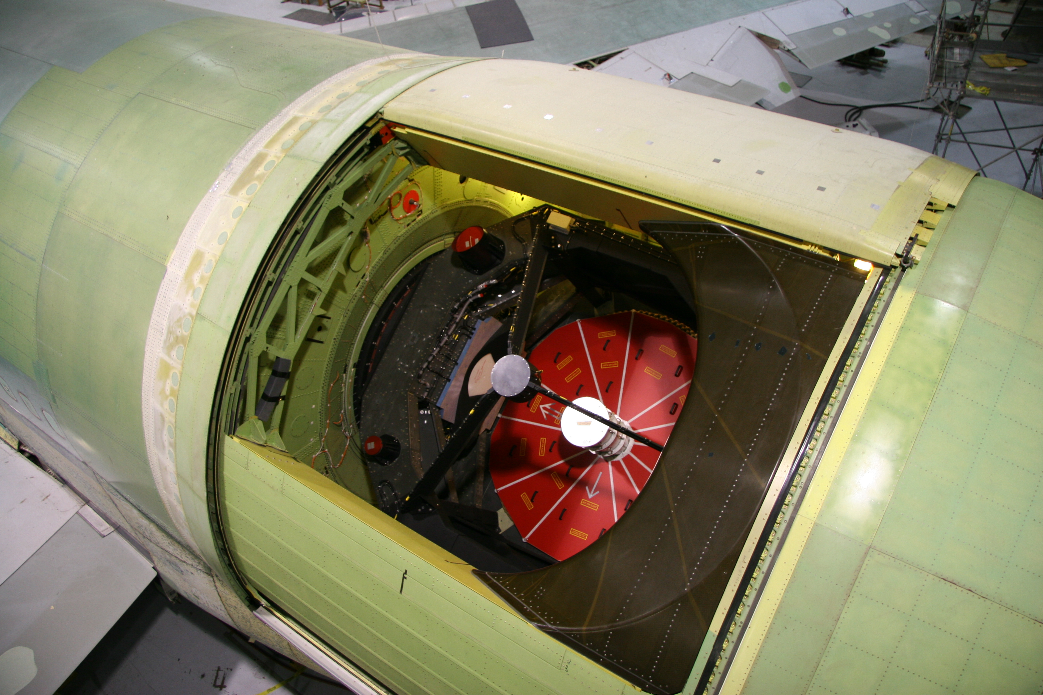 rlier this month, a 2.5-meter diameter infrared telescope was permanently assigned a window seat, looking through this opening in the fuselage of a historic Boeing 747 aircraft. The telescope mirror, about the size of the Hubble Space Telescope mirror, is protected by a red covering. Known as the Stratospheric Observatory For Infrared Astronomy (SOFIA), the airborne observatory is intended to fly at altitudes up to 45,000 feet - above more than 99% of the atmospheric water vapor. Water vapor strongly absorbs infrared light, so at that altitude SOFIA will be able to acquire infrared images not possible for even the largest ground-based telescopes. SOFIA's unique capabilities will include the ability to trace complex molecules in the cosmic environments surrounding star birth and death and the formation of new solar systems. The SOFIA aircraft was operated by Pan American World Airways and was originally christened the "Clipper Lindbergh". The airborne observatory was designed with an on board console for teachers and other educators to participate in research flights.