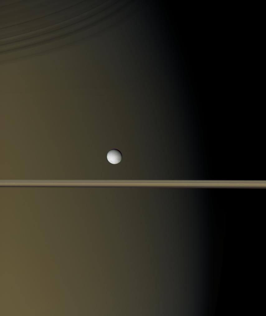 Some images of Saturn appear surreal. Earlier this year, the robot spacecraft Cassini now orbiting Saturn took this surreal image of the gas giant Saturn, its majestic rings, and its enigmatic world Enceladus all in one frame. Enceladus, recently found to emit jets of ice from possible underground seas, appears white as its surface is covered with relatively clean water-ice. Below Enceladus are the rings of Saturn, seen nearly edge on. Compared to Enceladus, Saturn's rings show their comparatively high density of dirt with their golden-brown color in this natural color image. The planet Saturn, in the background, appears relatively featureless with the exception of thin ring shadows visible on the upper left. The terminator between night and day is seen vertically across the face of this distant world.