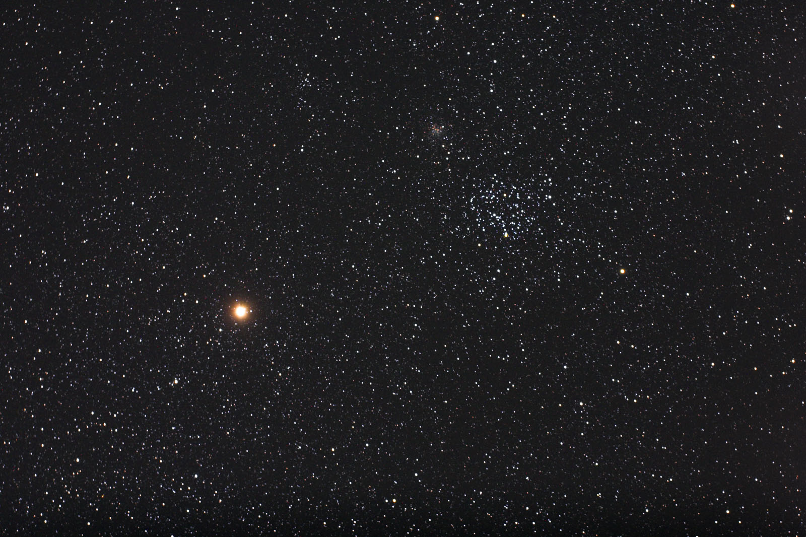 Este panorama nocturno de esta noche incluye una vista similar a la registrada en los cielos occidentales el 16 de abril: el planeta Marte, de tonalidad anaranjada, deambulando cerca del rico cúmulo abierto M35. También es notable el cúmulo estelar más débil NGC 2158, justo arriba y a la izquierda de M35. El conjunto aparece cerca de las "estrellas del pie" de la constelación de Géminis, pero por supuesto Marte está en primer plano, a poco más de 14 minutos luz del planeta Tierra. Los cientos de estrellas del cúmulo M35 se encuentran mucho más lejos, a unos 3.000 años luz de distancia. NGC 2158 está aún más lejano, a unos 16.000 años luz de distancia, y es mucho más compacto que M35. La imagen a color muestra el contraste entre las estrellas azules calientes y las estrellas amarillentas más frías dentro de los confines de M35. Sin embargo, las estrellas de NGC 2158 son mucho más antiguas, y la luz de ese cúmulo está definitivamente dominada por el resplandor anaranjado de las estrellas gigantes frías, lo que crea una comparación visual interesante con el Marte de color rojizo.