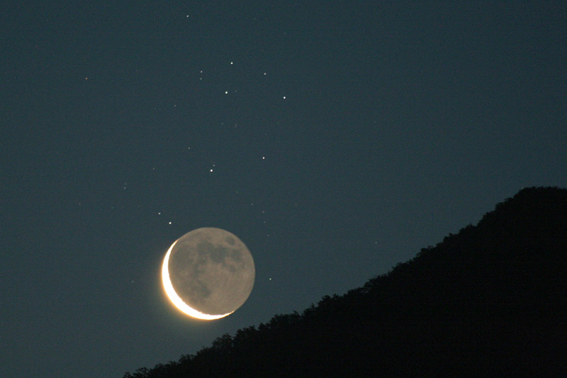 An old crescent Moon shares the eastern sky over Menton, France with the sister stars of the Pleiades cluster in this early morning skyscape recorded just last Friday, June 23rd. (Bright Venus was also near the eastern horizon, but is not pictured here.) Astronomical images of the well-known Pleiades often show the cluster's alluring blue reflection nebulae, but they are washed out here by the bright moonlight. Still, while the crescent Moon is overexposed, surface features can be seen on the dim lunar night side illuminated by earthshine - light from sunlit planet Earth. Of course, you can spot a young crescent Moon in the early evening sky tonight. Having left the Pleiades behind, a lovely lunar crescent now appears in the west, lining up with planets Mars, Saturn, and Mercury along the solar system's ecliptic plane.
