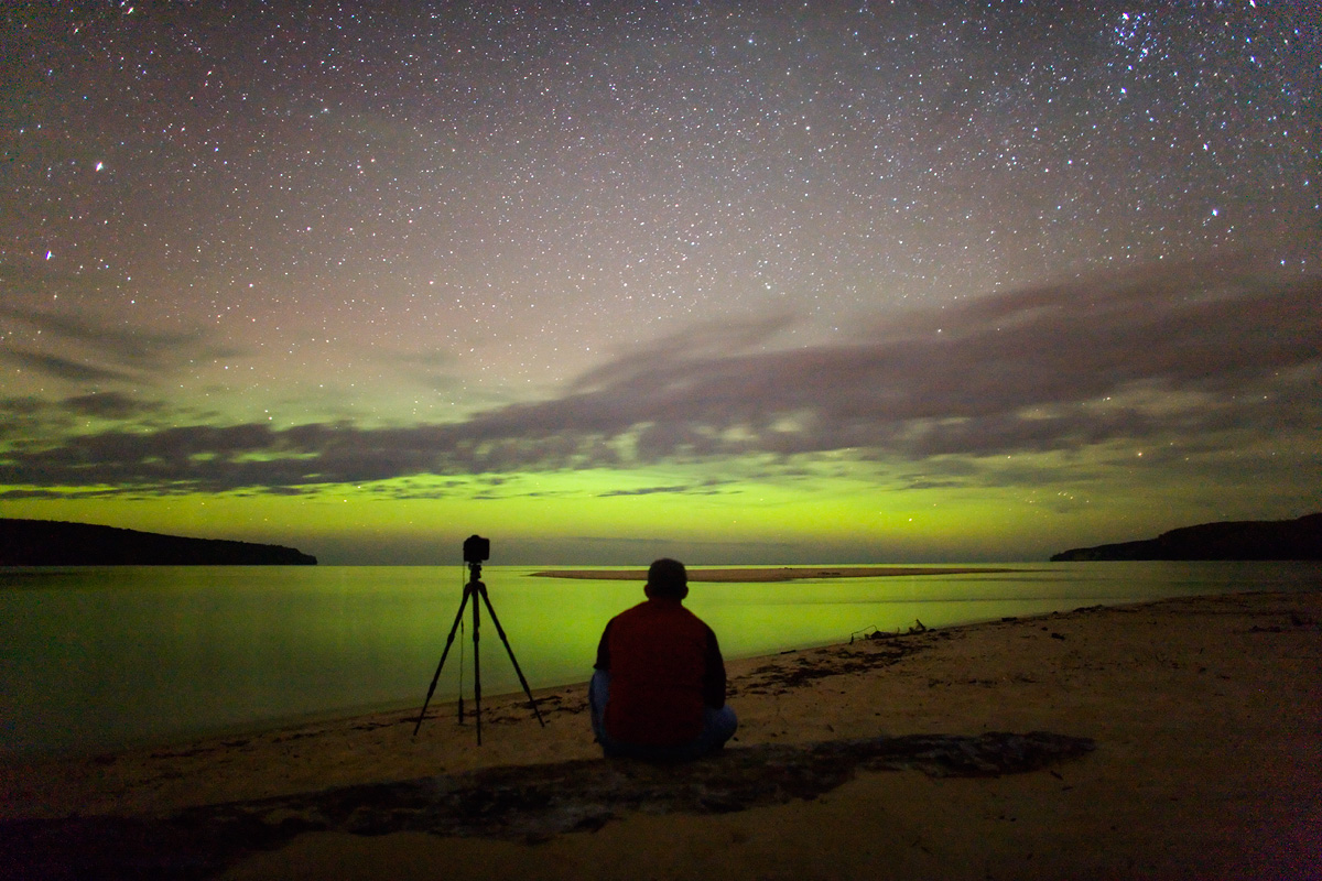¿Y si tu horizonte fuera verde? Si tienes una cámara, ¡toma una foto! Esa fue la experiencia de Jeff Hapeman la semana pasada al visitar el Pictured Rocks National Lakeshore en Michigan. En una tranquila noche, hacia el horizonte norte sobre el lago Superior, se observó una aurora verde difusa de larga duración. La imagen mostrada se tomó con el objetivo de capturar la sensación de asombro que se experimenta al observar una exhibición auroral. Las auroras son provocadas por partículas energéticas del Sol que impactan en el entorno magnético de la Tierra. Las partículas energéticas resultantes, como electrones y protones, caen cerca de los polos terrestres e impactan en la atmósfera. Las moléculas del aire golpeadas pierden temporalmente electrones, y cuando las moléculas de oxígeno entre ellas recuperan estos electrones, emiten luz verde. Se sabe que las auroras tienen muchas formas y colores.