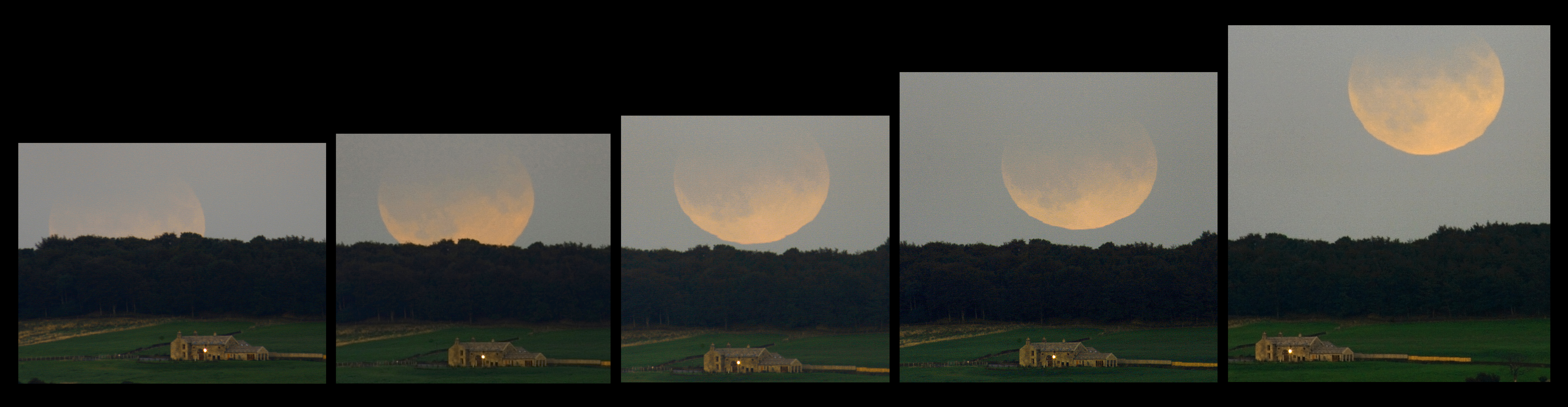 Last Thursday, part of our Moon turned dark. The cause, this time, was not a partial lunar phase -- the Moon was full -- but rather that part of the Moon went into Earth's shadow. The resulting partial lunar eclipse was visible from the eastern Atlantic Ocean through Europe, Africa, and Asia and into the western Pacific Ocean. The darkest part of the lunar eclipse, when part of the Moon was completely shielded from sunlight, lasted about 90 minutes. Pictured above, a partially eclipsed Moon is seen rising over an estate in Huddersfield, England. The above image was taken far away from the house in the foreground, as only this would allow it to appear as angularly small as the half-degree Moon far in the background. A setting twilight Sun lit the foreground. The next eclipse of the Moon will occur in March 2007.