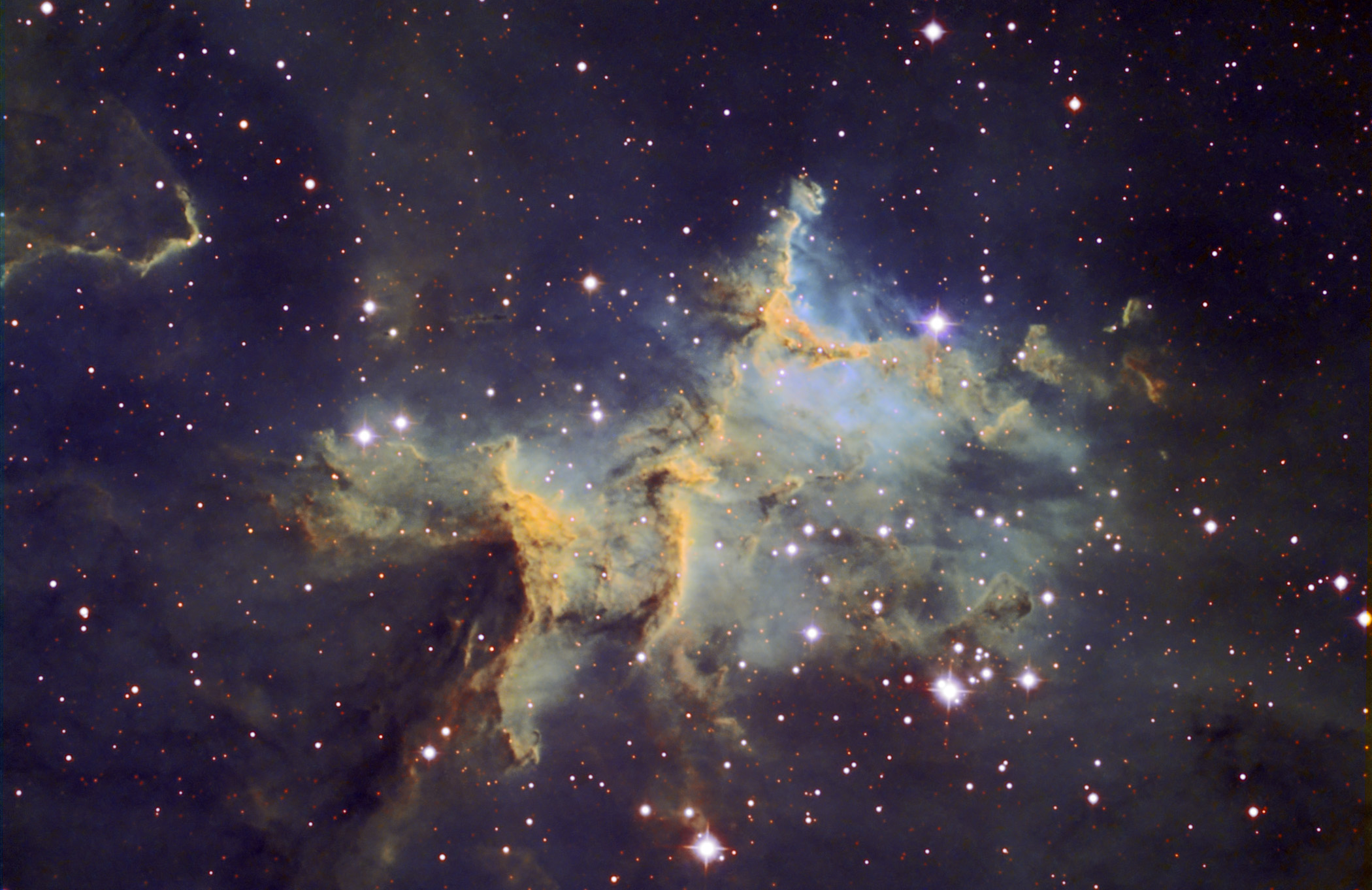 Crédito: NASA, CGRO SSC Las nubes cósmicas parecen formar formas fantásticas en las regiones centrales de la nebulosa de emisión IC 1805. Por supuesto, las nubes son moldeadas por los vientos estelares y la radiación de estrellas masivas y calientes del reciente cúmulo estelar de la nebulosa (también conocido como Melotte 15). Con alrededor de 1.5 millones de años de antigüedad, las estrellas del cúmulo aparecen en esta escena colorida, junto con nubes oscuras de polvo en silueta contra el gas atómico que brilla. Una composición de imágenes telescópicas de banda estrecha, la vista abarca aproximadamente 15 años luz y muestra la emisión del hidrógeno en tonos verdes, el azufre en rojos y el oxígeno en tonos azules. Imágenes de campo más amplio revelan que el contorno general más simple de IC 1805 sugiere su nombre popular: La Nebulosa del Corazón. IC 1805 se encuentra a unos 7.500 años luz de distancia en dirección a la constelación de Casiopea.