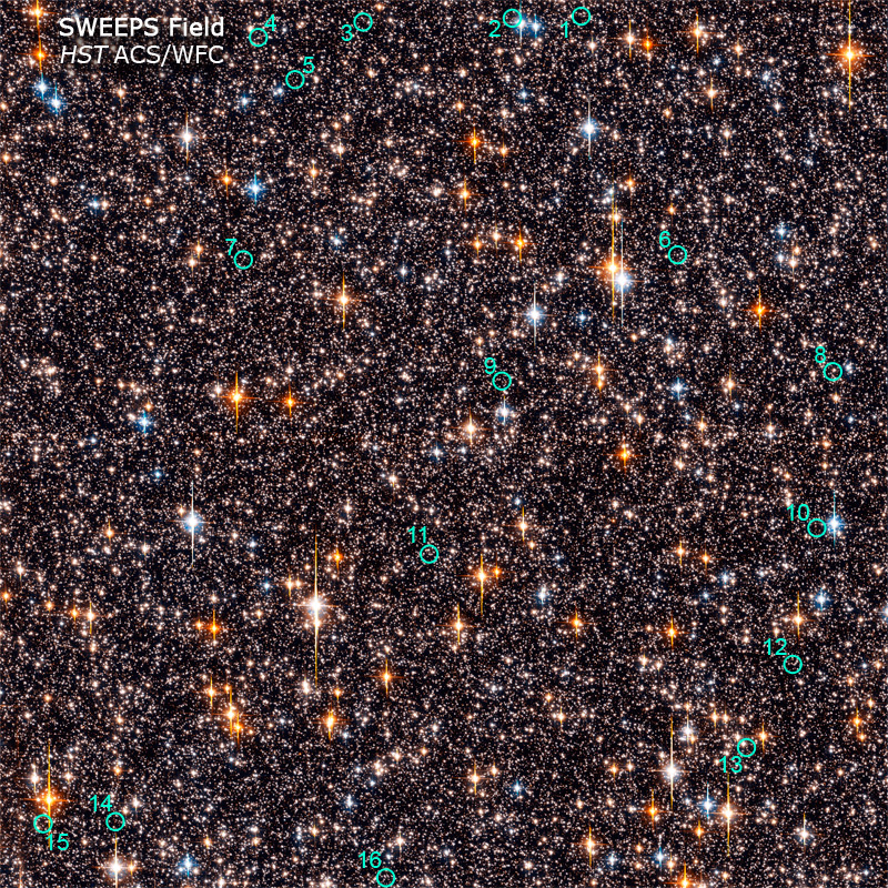 Este campo estelar congestionado hacia el centro de nuestra galaxia Vía Láctea resultó ser un lugar excelente para buscar planetas más allá de nuestro sistema solar. De hecho, al tomar imágenes repetidas de aproximadamente 180 000 estrellas en el campo durante un período de una semana, el telescopio espacial Hubble permitió a los astrónomos realizar la Búsqueda de Planetas Exterrestres por Eclipses en la Ventana de Sagitario (SWEEPS, por sus siglas en inglés). Su búsqueda se centró en buscar breves y periódicos descensos en la brillantez causados cuando un planeta grande eclipsa o transita su estrella madre. Dado que las probabilidades de observar tal eclipse son escasas, fue una ventaja definitiva examinar tantas estrellas como fuera posible. Al final, los astrónomos de SWEEPS encontraron 16 estrellas candidatas (los círculos verdes identifican 11 en esta imagen recortada) que probablemente estén orbitadas estrechamente por planetas grandes del tamaño de Júpiter con períodos de unos pocos días o menos. Los planetas grandes que orbitan tan cerca de sus estrellas se denominan Júpiteres calientes. Kepler, una futura misión de la NASA, tiene como objetivo extender la técnica de tránsito para buscar planetas del tamaño de la Tierra.