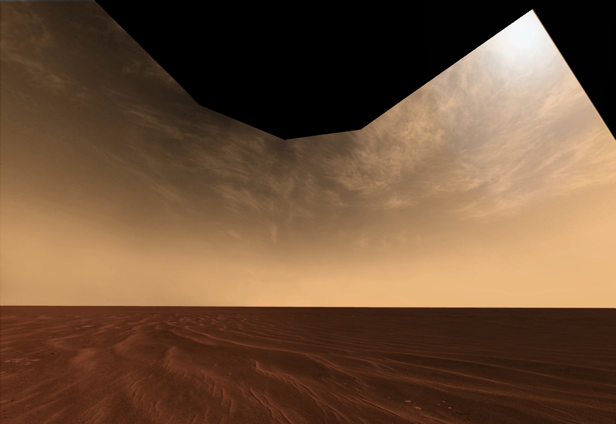 Si pudieras estar de pie en Marte, ¿qué verías? Al igual que el rover robótico Opportunity rodando por el planeta rojo, podrías ver amplias llanuras de arena roja, un cielo teñido de naranja y nubes ligeras y esponjosas. El rover Opportunity capturó precisamente tal paisaje después de llegar al Cráter Victoria a principios de este mes, aunque en una dirección completamente diferente del gran cráter. A diferencia de otros paisajes marcianos, pocos rocas son visibles en esta imagen mosaico con colores exagerados. El horizonte rojo distante es tan plano y sin características que parece similar al horizonte hacia un océano azul tranquilo en la Tierra. Las nubes en Marte pueden estar compuestas por hielo de dióxido de carbono o hielo de agua, y pueden moverse rápidamente, al igual que las nubes en la Tierra. El polvo rojo en la atmósfera marciana puede cambiar el color del cielo sobre Marte del azul que se observa sobre la Tierra hacia el rojo, con el color exacto dependiendo de la densidad y el tamaño de partícula del polvo que flota.
