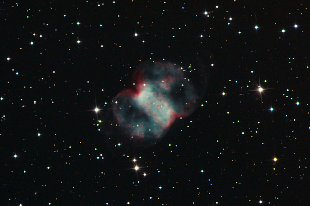 "Nebula at the right foot of Andromeda ... " begins the description for the 76th object in Charles Messier's 18th century Catalog of Nebulae and Star Clusters. In fact, M76 is one of the fainter objects on the Messier list and is also known by the popular name of the "Little Dumbbell Nebula". Like its brighter namesake M27 (the Dumbbell Nebula), M76 is recognized as a planetary nebula - a gaseous shroud cast off by a dying sunlike star. The nebula itself is thought to be shaped more like a donut, while its box-like appearance is due to our nearly edge-on view. Gas expanding more rapidly away from the donut hole produces the faint loops of far flung material. The nebula's dying star can be picked out in this sharp color image as the bottom, blue-tinted member of the double star near the center of the box-like shape. Distance estimates place M76 about 3 to 5 thousand light-years away, making the nebula over a light-year in diameter.