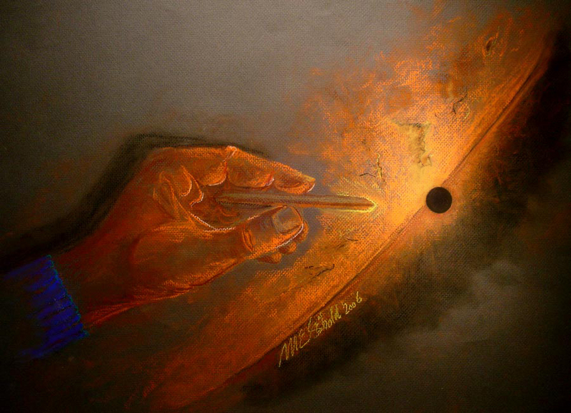 The sight of Mercury's tiny round disk drifting slowly across the face of the Sun inspired and entertained many denizens of planet Earth last week. In fact, artist and astronomer Mark Seibold viewed both the 1999 and 2006 transits of the solar system's innermost planet through solar filtered telescopes and composed this rendering of Mercury "hovering in the photosphere" near the edge of an enormous solar disk. The original work is a 23 by 17 inch pastel sketch. While the artist's hand is creatively superimposed, Seibold concentrated on offering an impression of Mercury's silhouette, surrounded by shadings reflecting his visual experience that are not easily captured in photographic exposures. Of course, before the age of cameras drawings were more widely used to record telescopic observations of sunspots and planetary transits.