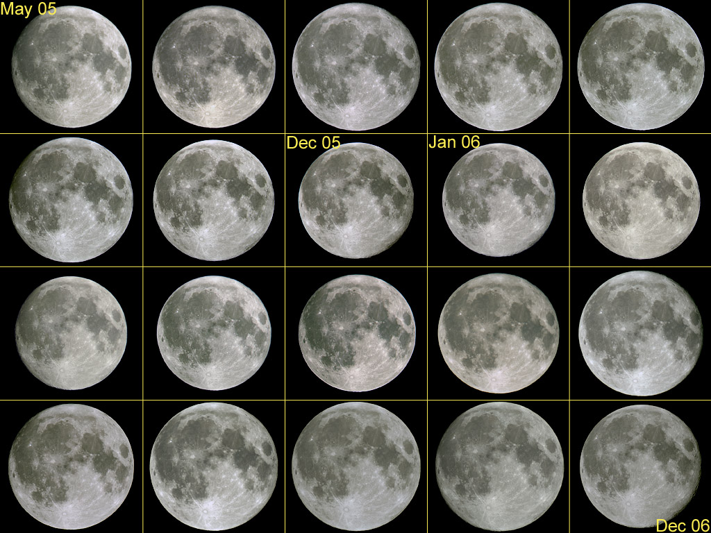 En celebración de la Luna Llena de esta noche, la primera de 2007, considere esta cuadrícula de veinte Lunas Llenas. De izquierda superior a derecha inferior, las imágenes representan cada lunación desde mayo de 2005 hasta diciembre de 2006. Las Lunas Llenas consecutivas se muestran todas a la misma escala, por lo que, a diferencia de la famosa Ilusión Lunar, el cambio en el tamaño aparente que se ve aquí es real. (Por ejemplo, compare las Lunas Llenas de principios y finales de 2006.) El cambio es causado por la variación en la distancia lunar debido a la órbita de la Luna significativamente no circular. Un cambio más sutil en la apariencia también se puede notar en un examen detallado, ya que la Luna parece bambolearse y mecerse ligeramente de una Luna Llena a la siguiente. Este efecto, conocido como libración, es más dramático y más fácil de ver en una película de veinte fotogramas que compara estas veinte Lunas Llenas.