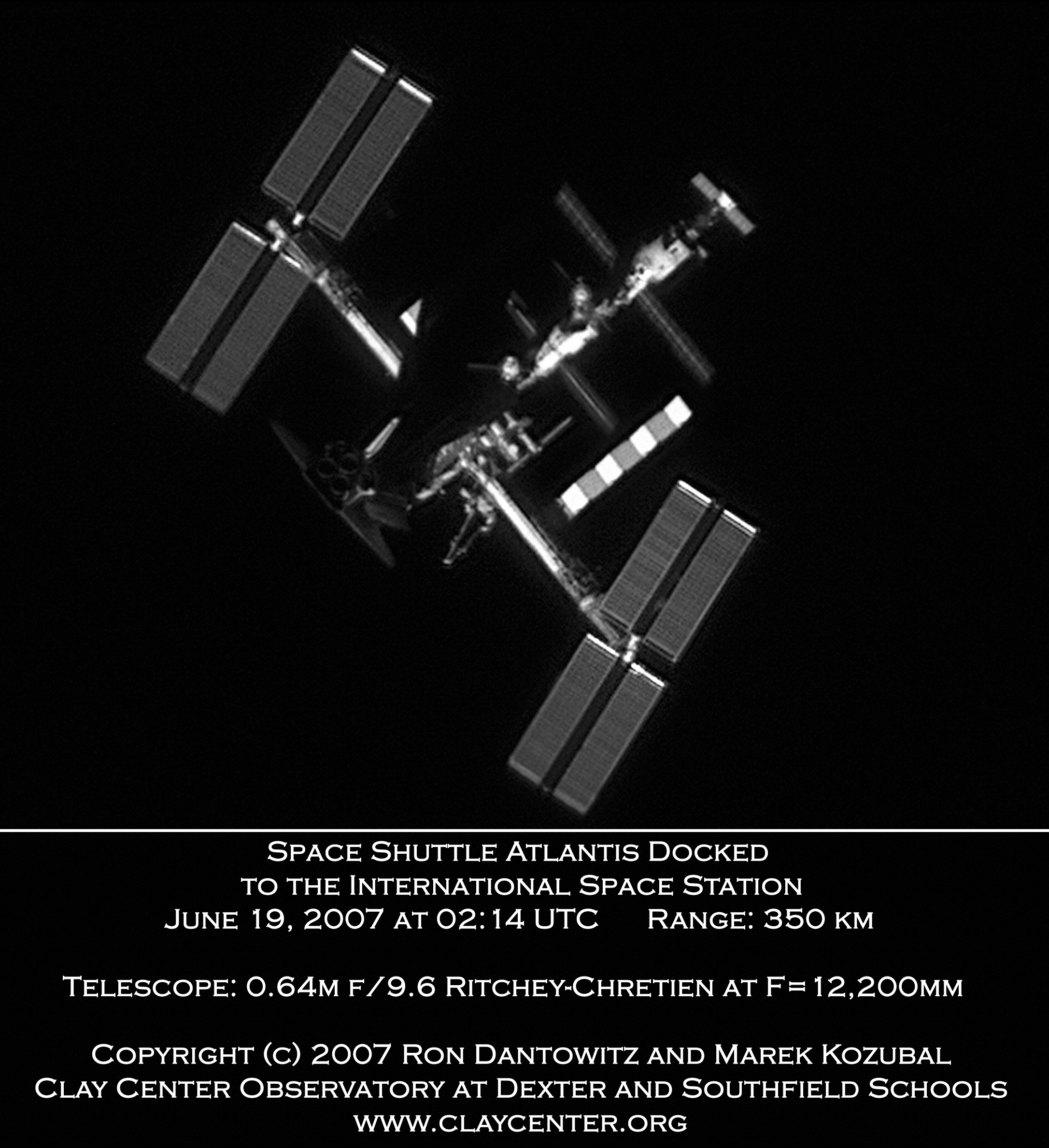 This remarkable image of the space shuttle orbiter Atlantis docked with the International Space Station (ISS) was taken at a range of 190 nautical miles. To record the fast moving pair, last week astronomers at Clay Center Observatory, near Boston, Massachusetts, planet Earth, used a satellite tracking system and 25-inch diameter telescope in combination with a digital video camera. In the sharp picture, Atlantis is below and left of center. The aft view shows three main engines just below its vertical tail glinting in the sunlight. With the Sun shining from below, the body of the orbiter casts a long shadow across the ISS itself and impressive details of the ISS solar arrays used for power generation are easily visible. The large set of solar arrays installed at the lower right was delivered during this visit from Atlantis.