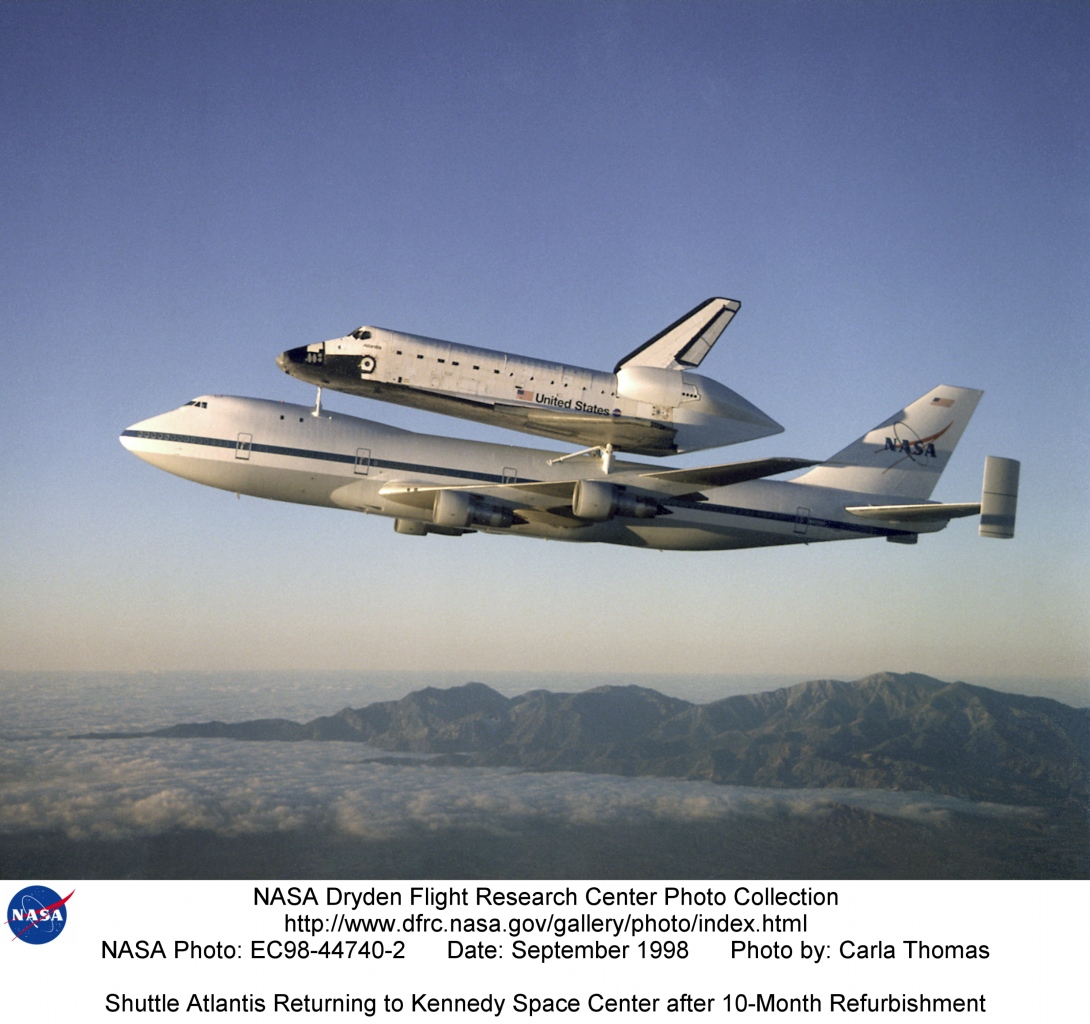 ¿Cómo regresa un transbordador espacial que aterrizó en California a Florida para su próximo lanzamiento? La respuesta es mediante transporte aéreo. La NASA opera dos aviones Boeing 747 comerciales modificados para transportar un transbordador espacial sobre sus espaldos. Designados oficialmente como Shuttle Carrier Aircraft o SCA, los 747 fueron construidos para vuelos comerciales pero reforzados por la NASA con varios soportes, estabilizadores y monitores electrónicos. Con una longitud de aproximadamente 70 metros, la masa combinada de los dos aviones es de casi 150.000 kilogramos. En la imagen superior, se muestra el transbordador espacial Atlantis siendo transportado de regreso al Centro Espacial Kennedy de la NASA en Florida en septiembre de 1998.
