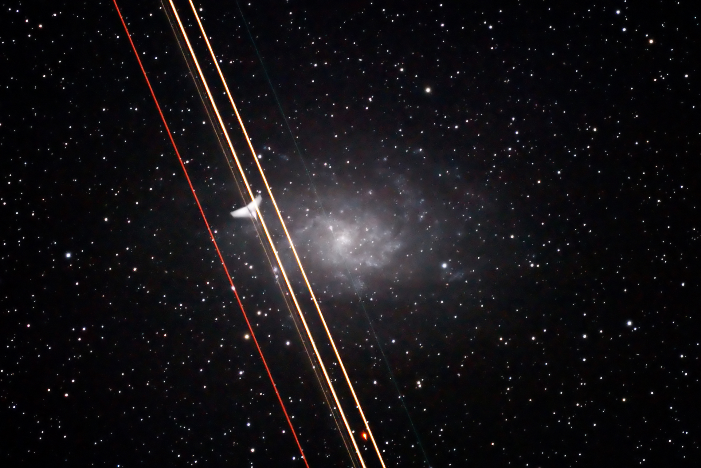 M33 es una gran y hermosa galaxia espiral a tan solo 3 millones de años luz de distancia, comprensiblemente un objetivo popular para astrofotógrafos entusiastas. Igualmente comprensible es que los rastros interferentes de satélites y estelas de aviones, que se vuelven cada vez más comunes en el ajetreado cielo nocturno del planeta Tierra, se eliminen de sus imágenes finales. Sin embargo, Robert Stephan decidió mantener estas estelas en su imagen final de M33, percatándose de que había capturado algo relativamente raro. Su fotografía celeste de otra forma típica muestra la cola de una aeronave pasando sobre su campo de visión del telescopio. Una luz estroboscópica de navegación en el avión iluminó la cola en el momento exacto. La breve iluminación produjo una imagen incongruente, aunque notablemente nítida.