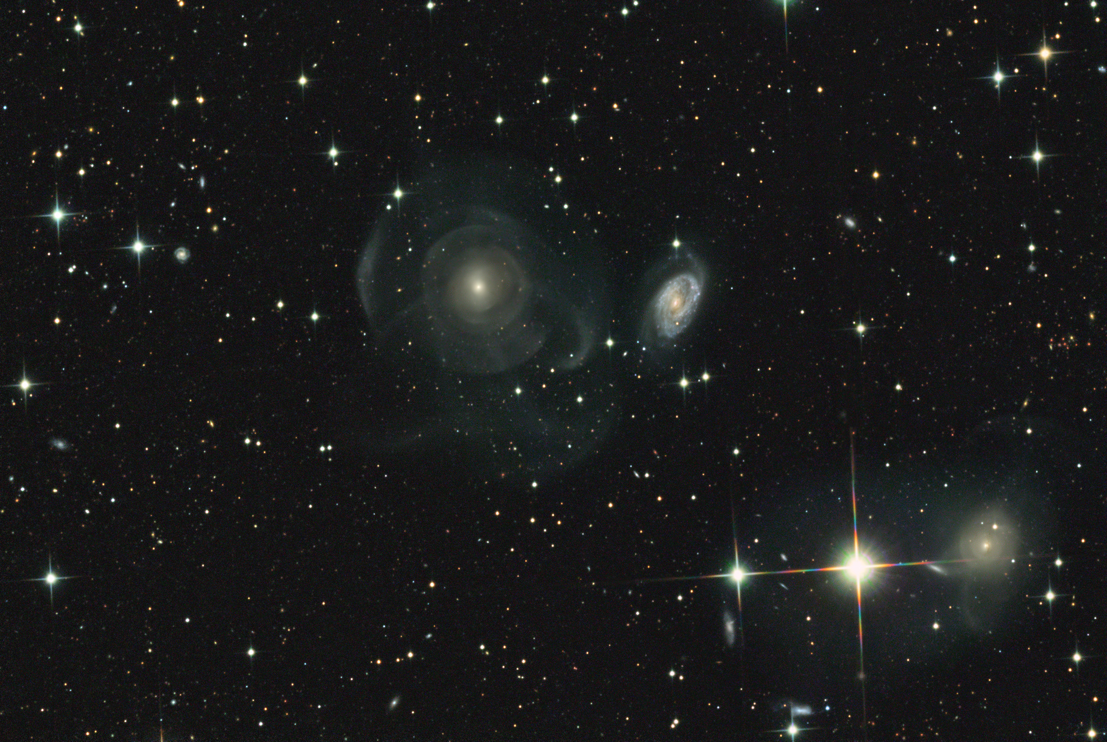 ¿Qué está sucediendo con la galaxia NGC 474? Las múltiples capas de emisión parecen extrañamente complejas e inesperadas dada la apariencia relativamente uniforme de la galaxia elíptica en imágenes menos profundas. La causa de las envolturas es actualmente desconocida, pero posiblemente se deba a colas de marea relacionadas con los escombros dejados por la absorción de numerosas galaxias pequeñas en el pasado mil millones de años. Alternativamente, las envolturas pueden ser como ondas en un estanque, donde la colisión continua con la galaxia espiral a la derecha de NGC 474 está causando ondas de densidad que se propagan a través del gigante galáctico. Independientemente de la causa real, la imagen anterior destaca dramáticamente el consenso creciente de que los halos externos de la mayoría de las galaxias grandes no son realmente suaves sino que presentan complejidades inducidas por frecuentes interacciones con —y acreciones de— galaxias más pequeñas cercanas. El halo de nuestra propia Galaxia Vía Láctea es un ejemplo de tal complejidad inesperada. NGC 474 abarca aproximadamente 250.000 años luz y se encuentra a aproximadamente 100 millones de años luz de distancia hacia la constelación de Piscis.