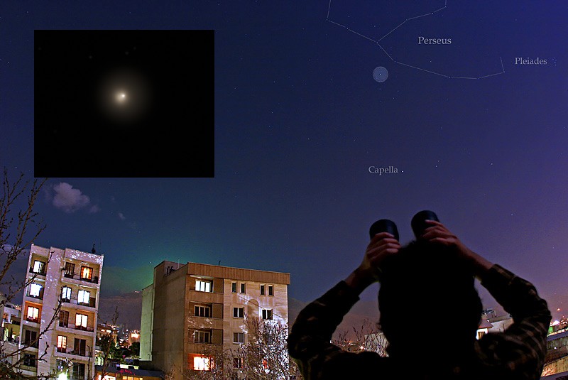 Comet 17P/Holmes stunned comet watchers across planet Earth earlier this week. On October 24, it increased in brightness over half a million times in a matter of hours. The outburst transformed it from an obscure and faint comet quietly orbiting the Sun with a period of about 7 years to a naked-eye comet rivaling the brighter stars in the constellation Perseus. Recorded on that date, this view from Tehran, Iran highlights the comet's (enhanced and circled) dramatic new visibility in urban skies. The inset (left) is a telescopic image from a backyard in Buffalo, New York showing the comet's greatly expanded coma, but apparent lack of a tail. Holmes' outburst could be due to a sudden exposure of fresh cometary ice or even the breakup of the comet nucleus. The comet may well remain bright in the coming days.