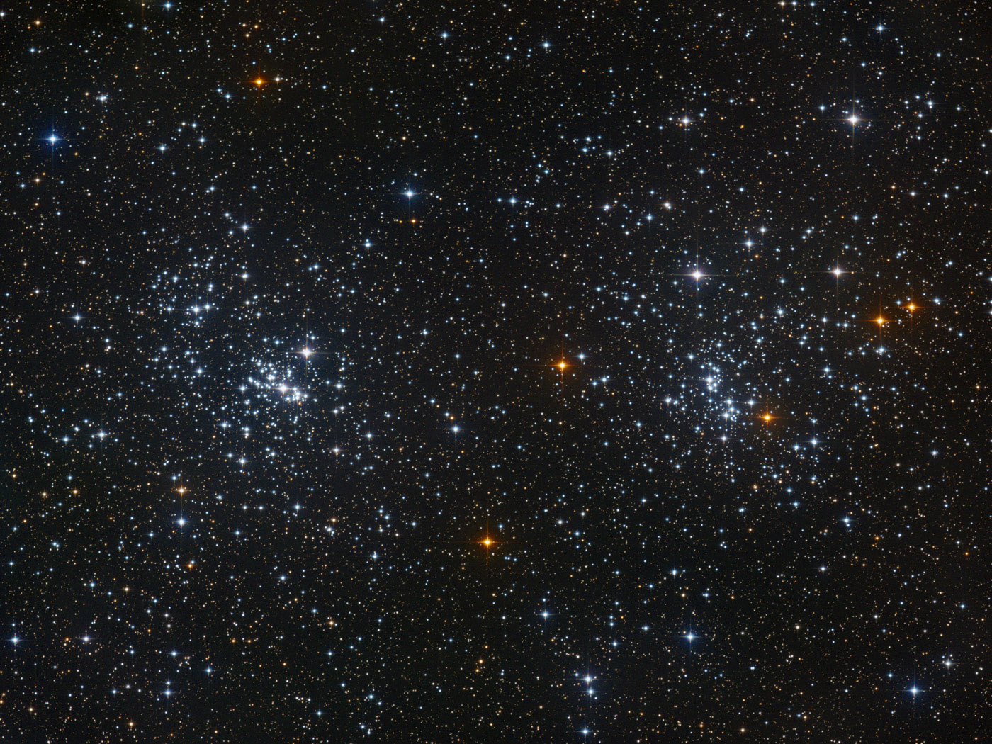 Los observadores del cielo que recientemente han seguido al Cometa Holmes probablemente también se han topado con este hermoso campo estelar, no muy lejos del cometa en el cielo en la constelación de Perseo. A unos 7.000 años luz de distancia, este par de cúmulos estelares abiertos o galácticos es un objetivo fácil para binoculares y es visible a simple vista desde áreas de cielo oscuro. De hecho, fue catalogado en el 130 a.C. por el astrónomo griego Hiparco. Ahora conocidos como h y chi Persei, o NGC 869 (izquierda) y NGC 884, los cúmulos están separados entre sí por solo algunos cientos de años luz y contienen estrellas mucho más jóvenes y calientes que el Sol. Además de estar físicamente próximos, las edades de los cúmulos basadas en sus estrellas individuales son similares, lo que es evidencia de que ambos cúmulos fueron probablemente producto de la misma región de formación estelar.