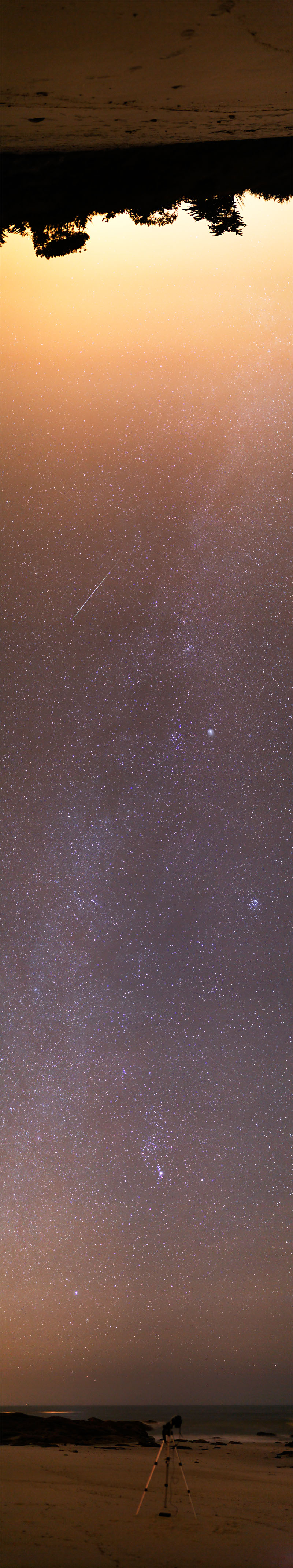 Scroll right and journey from horizon to horizon as your gaze sweeps through the zenith in the night sky over Beg-Meil, France. Recorded on December 13th, the entertaining panorama (image key) covers 210 degrees in 21 separate exposures, beginning on the beach with bright star Sirius rising in the southeast. Look up (pan right) to encounter the nebula rich constellation of Orion and continue on to find the lovely Pleiades star cluster. Farther along, higher in the sky, is the famous Comet Holmes, still gracing the northern hemisphere's night with its remarkable expanding coma. Finally, just before diving into the urban glow from city lights along the northwestern horizon (far right), check out the double star cluster in Perseus and take in the cosmic streak of a bright Geminid Meteor. APOD presents: Astronomy Pictures of the Year for 2007