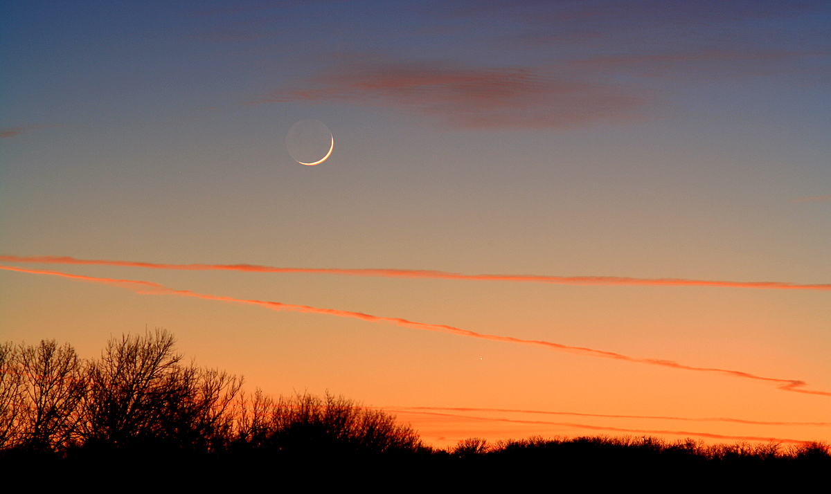 Esta colorida vista del cielo occidental al atardecer presenta la delgada Luna creciente de hace el miércoles pasado. Por supuesto, cuando la Luna se encuentra en su fase creciente, nunca puede estar lejos del Sol en el cielo. El planeta más interno, Mercurio, también siempre está cerca del Sol en el cielo terrestre, y se ve aquí debajo y a la derecha del centro contra el brillo naranja intenso a lo largo del horizonte. Mercurio es normalmente difícil de vislumbrar debido a la abrumadora luz solar, pero serán posibles vistas cada vez mejores del pequeño planeta después del atardecer conforme se aleja más hacia el este del Sol en los próximos días. El 14 de enero, la nave espacial MESSENGER de la NASA también tendrá una buena vista, ya que realizará su primer sobrevuelo de Mercurio.