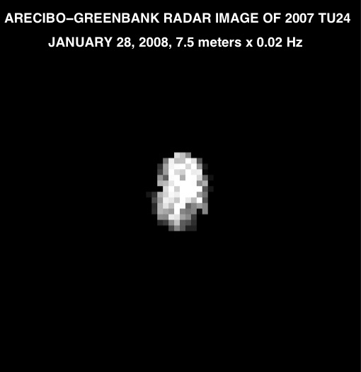 Asteroid 2007 TU24 passed by the Earth yesterday, posing no danger. The space rock, estimated to be about 250 meters across, coasted by just outside the orbit of Earth's Moon. The passing was not very unusual -- small rocks strike Earth daily, and in 2003 a rock the size of a bus passed inside the orbit of the Moon, being detected only after passing. TU24 was notable partly because it was so large. Were TU24 to have struck land, it might have caused a magnitude seven earthquake and left a city-sized crater. A perhaps larger danger would have occurred were TU24 to have struck the ocean and raised a large tsunami. This radar image was taken two days ago. The Arecibo Radio Telescope in Puerto Rico broadcast radar that was reflected by the asteroid and then recorded by the Byrd Radio Telescope in Green Bank, West Virginia. The resulting image shows TU24 to have an oblong and irregular shape. TU24 was discovered only three months ago, indicating that other potentially hazardous asteroids might lurk in our Solar System currently undetected. Objects like TU24 are hard to detect because they are so faint and move so fast. Humanity's ability to scan the sky to detect, catalog, and analyze such objects has increased notably in recent years.