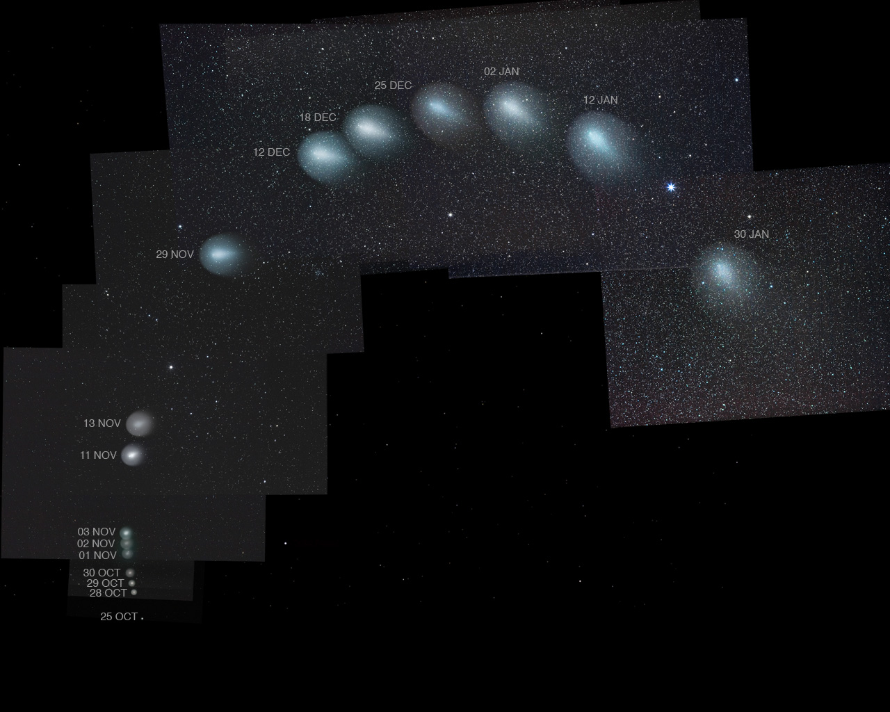 ¿Cómo ha cambiado el Cometa Holmes? Desde su inesperado aumento de brillo de casi un millón de veces a finales de octubre, los últimos tres meses han mostrado que la coma del Cometa 17P/Holmes se ha expandido y desvanecido. Esta imagen compuesta espectacular muestra cómo han cambiado la coma y la cola del Cometa Holmes. Debido al cambio de perspectiva de la Tierra, el Cometa Holmes, ubicado más allá de la órbita de Marte, fue visto en noviembre casi de frente, pero en los últimos meses se ve más desde el lado. Además, el movimiento del cometa, cuando se combina con la perspectiva cambiante de la Tierra, ha causado que el cometa se haya desplazado en relación con las estrellas de fondo. La trayectoria curva del Cometa Holmes muestra que está experimentando movimiento retrógrado aparente mientras la Tierra orbita rápidamente frente a él. La extensión actual de la coma hace que el Cometa Holmes sea más de cinco veces el tamaño físico de nuestro Sol. Evidencia anecdótica indica que el cometa es difícil de ver sin exposiciones fotográficas prolongadas, pero en tales exposiciones el cometa puede seguir siendo una vista impresionante.