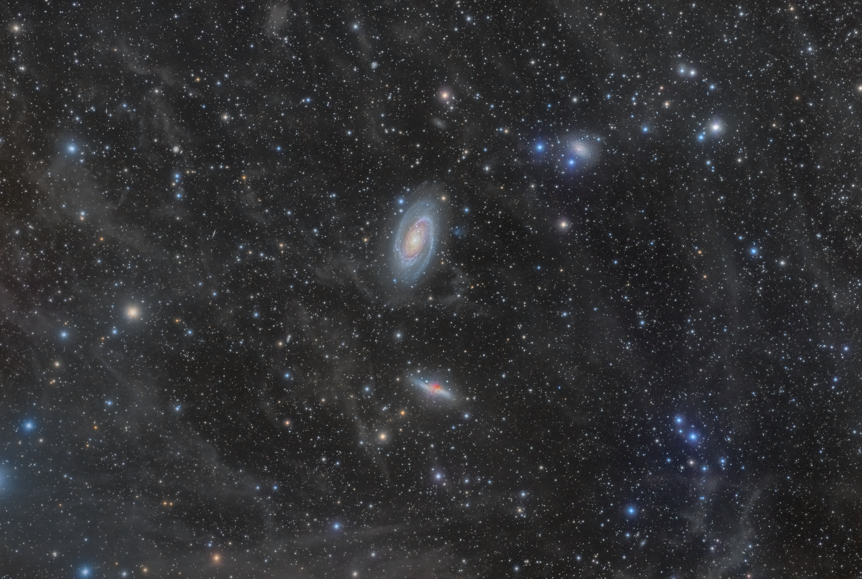 Galaxias grandes y nebulosas tenues destacan en esta imagen profunda del Grupo de Galaxias M81. Lo más prominente en la exposición de gran angular de 12 horas es la majestuosa galaxia espiral de diseño clásico M81, la galaxia más grande visible en la imagen. M81 está interactuando gravitacionalmente con M82, justo debajo de ella, una gran galaxia con un inusual halo de gas que brilla en rojo con estructuras filamentosas. Alrededor de la imagen se pueden observar muchas otras galaxias del Grupo de Galaxias M81. Junto con otros cúmulos de galaxias incluyendo nuestro Grupo Local de galaxias y el Cúmulo de Galaxias de Virgo, el Grupo M81 forma parte de la expansiva Supercúmulo de Galaxias de Virgo. Todo este conjunto de galaxias se observa a través del débil brillo de una Nebulosa de Flujo Integrado, un complejo poco estudiado de gas difuso y nubes de polvo en nuestra Galaxia Vía Láctea.