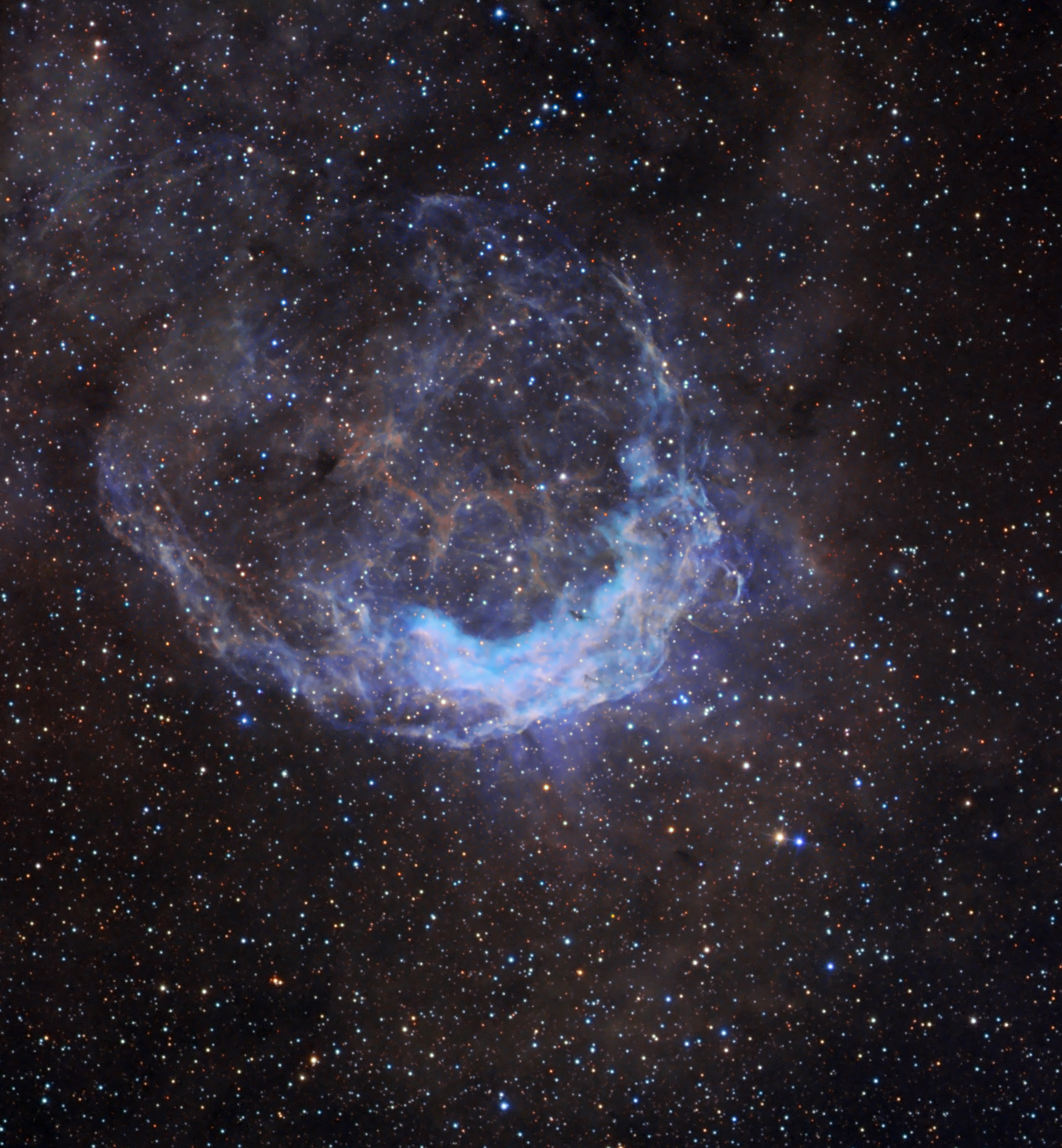 NGC 3199 se encuentra aproximadamente a 12.000 años luz de distancia, una nube cósmica luminosa en la constelación meridional de Carina. La nebulosa tiene unos 75 años luz de diámetro en esta vista inquietante en falso color. Aunque la imagen profunda revela una forma más o menos de anillo completo, es muy asimétrica con un borde mucho más brillante en la parte inferior derecha. Cerca del centro del anillo hay una estrella Wolf-Rayet, una estrella masiva, caliente y de vida corta que genera un viento estelar intenso. De hecho, las estrellas Wolf-Rayet son conocidas por crear nebulosas con formas interesantes mientras sus potentes vientos barren el material interestelar circundante. En este caso, se pensaba que el borde brillante indicaba una onda de proa producida cuando la estrella se abría paso a través de un medio uniforme, como un barco en el agua. Sin embargo, las mediciones han demostrado que la estrella en realidad no se está moviendo directamente hacia el borde brillante. Por lo tanto, una explicación más probable es que el material que rodea la estrella no es uniforme, sino que está aglomerado y es más denso cerca del borde brillante de NGC 3199 barrida por el viento.