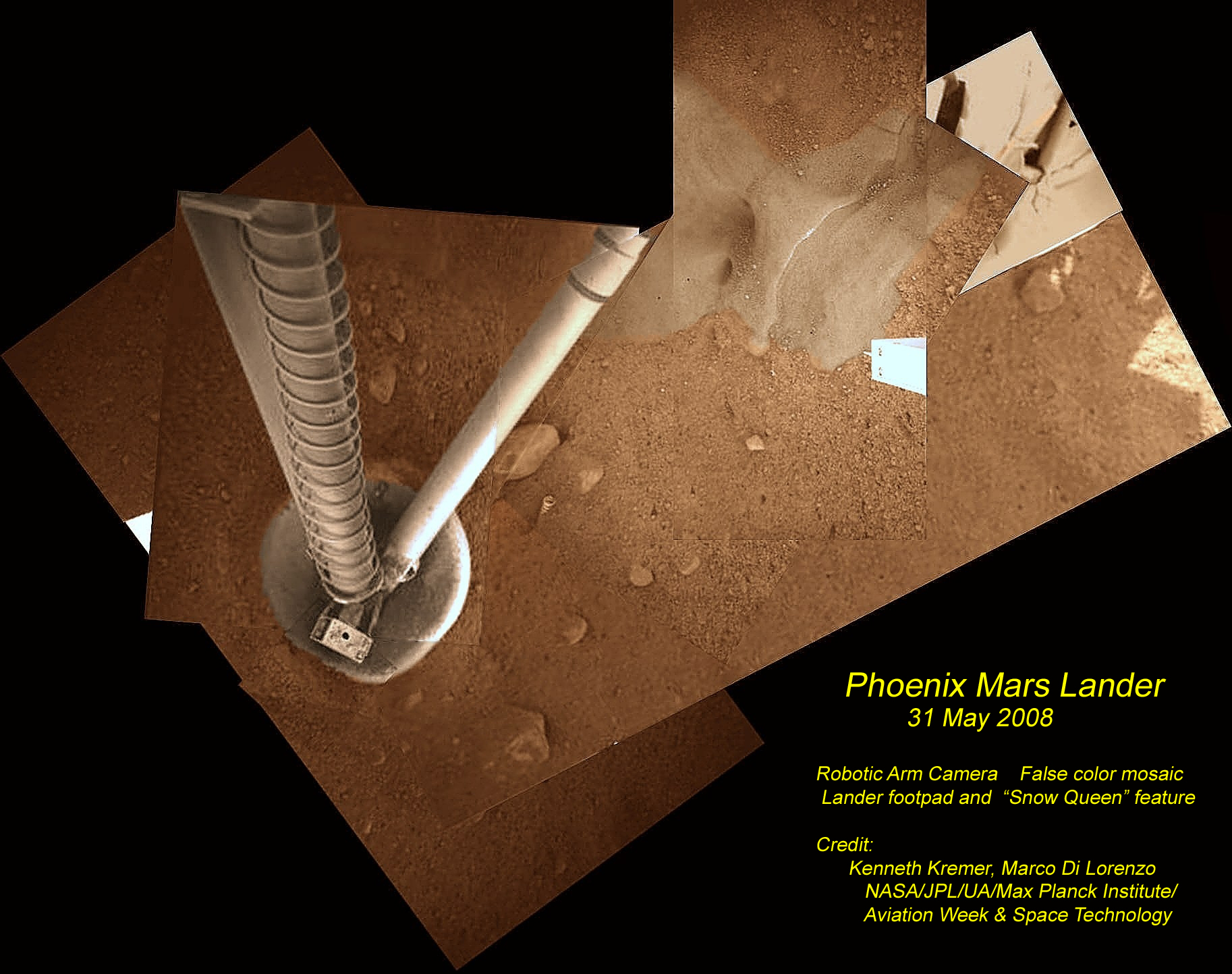 Una característica plana, lisa y brillante denominada Reina de la Nieve se encuentra cerca de la parte superior de este mosaico en color de la superficie bajo el módulo de aterrizaje Phoenix en Marte. Registrada con la cámara del brazo robótico del módulo, maniobrada para mirar bajo el lander, la región también incluye una pata y una placa del tamaño de una pisada. Un detalle intrigante cerca de la placa de apoyo, aproximadamente en la posición de las 2 en punto, es un resorte metálico parcialmente enterrado en el suelo marciano, una pieza de la biobúveda ahora abierta del brazo. Se sospecha fuertemente que la característica lisa Reina de la Nieve es hielo originalmente enterrado bajo el suelo, descubierto por los cohetes de propulsión mientras Phoenix se posaba en las llanuras del polo norte de Marte. De hecho, los aparentes agujeros o depresiones en la superficie por lo demás plana de la Reina de la Nieve se encuentran justo bajo los impulsores.