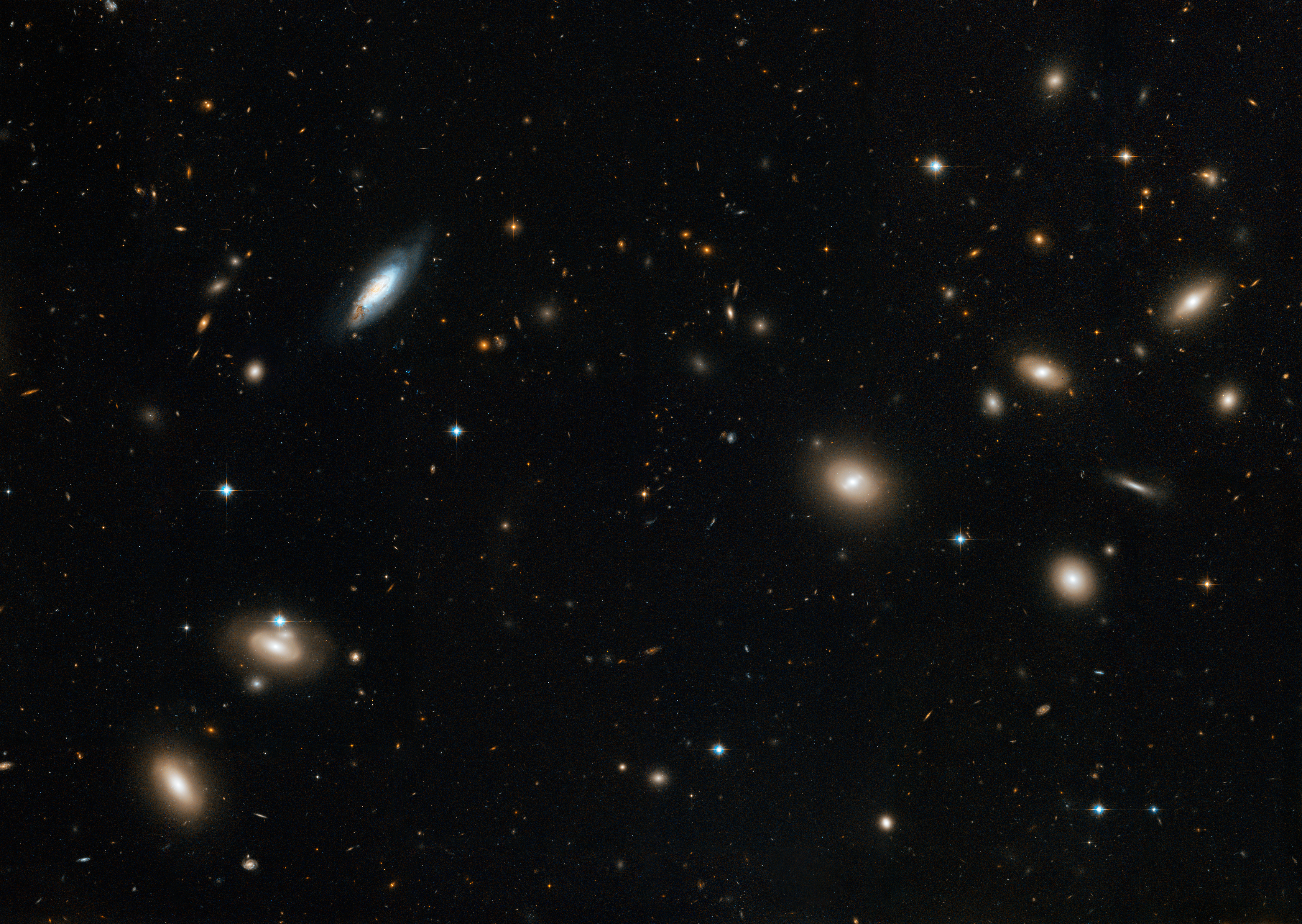 Casi todos los objetos en la fotografía anterior son galaxias. El Cúmulo de Galaxias de Coma que se muestra arriba es uno de los cúmulos más densos conocidos: contiene miles de galaxias. Cada una de estas galaxias alberga miles de millones de estrellas, tal como lo hace nuestra propia Galaxia de la Vía Láctea. Aunque cercano comparado con la mayoría de otros cúmulos, la luz del Cúmulo de Coma aún tarda cientos de millones de años en alcanzarnos. De hecho, el Cúmulo de Coma es tan grande que la luz tarda millones de años en ir de un lado al otro. El mosaico anterior de imágenes de una pequeña porción de Coma fue capturado con detalle sin precedentes por el Telescopio Espacial Hubble para investigar cómo se forman y evolucionan las galaxias en cúmulos ricos. La mayoría de las galaxias en Coma y otros cúmulos son elípticas, aunque algunas imágenes aquí son claramente espirales. La galaxia espiral en la parte superior izquierda de la imagen anterior también se puede encontrar como una de las galaxias más azules en la parte superior izquierda de esta imagen de campo más amplio. En el fondo, miles de galaxias no relacionadas son visibles a través del universo.