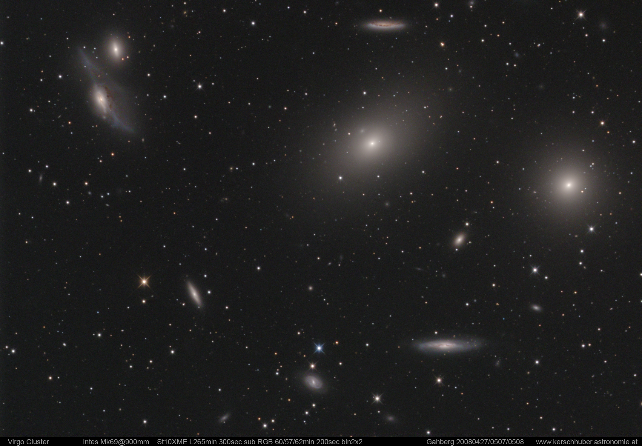 The Virgo Cluster of Galaxies is the closest cluster of galaxies to our Milky Way Galaxy. The Virgo Cluster is so close that it spans more than 5 degrees on the sky - about 10 times the angle made by a full Moon. With its heart lying about 70 million light years distant, the Virgo Cluster is the nearest cluster of galaxies, contains over 2,000 galaxies, and has a noticeable gravitational pull on the galaxies of the Local Group of Galaxies surrounding our Milky Way Galaxy. The cluster contains not only galaxies filled with stars but also gas so hot it glows in X-rays. Motions of galaxies in and around clusters indicate that they contain more dark matter than any visible matter we can see. Pictured above, the heart of the Virgo Cluster includes bright Messier galaxies such as Markarian's Eyes on the upper left, M86 just to the upper right of center, M84 on the far right, as well as spiral galaxy NGC 4388 at the bottom right.