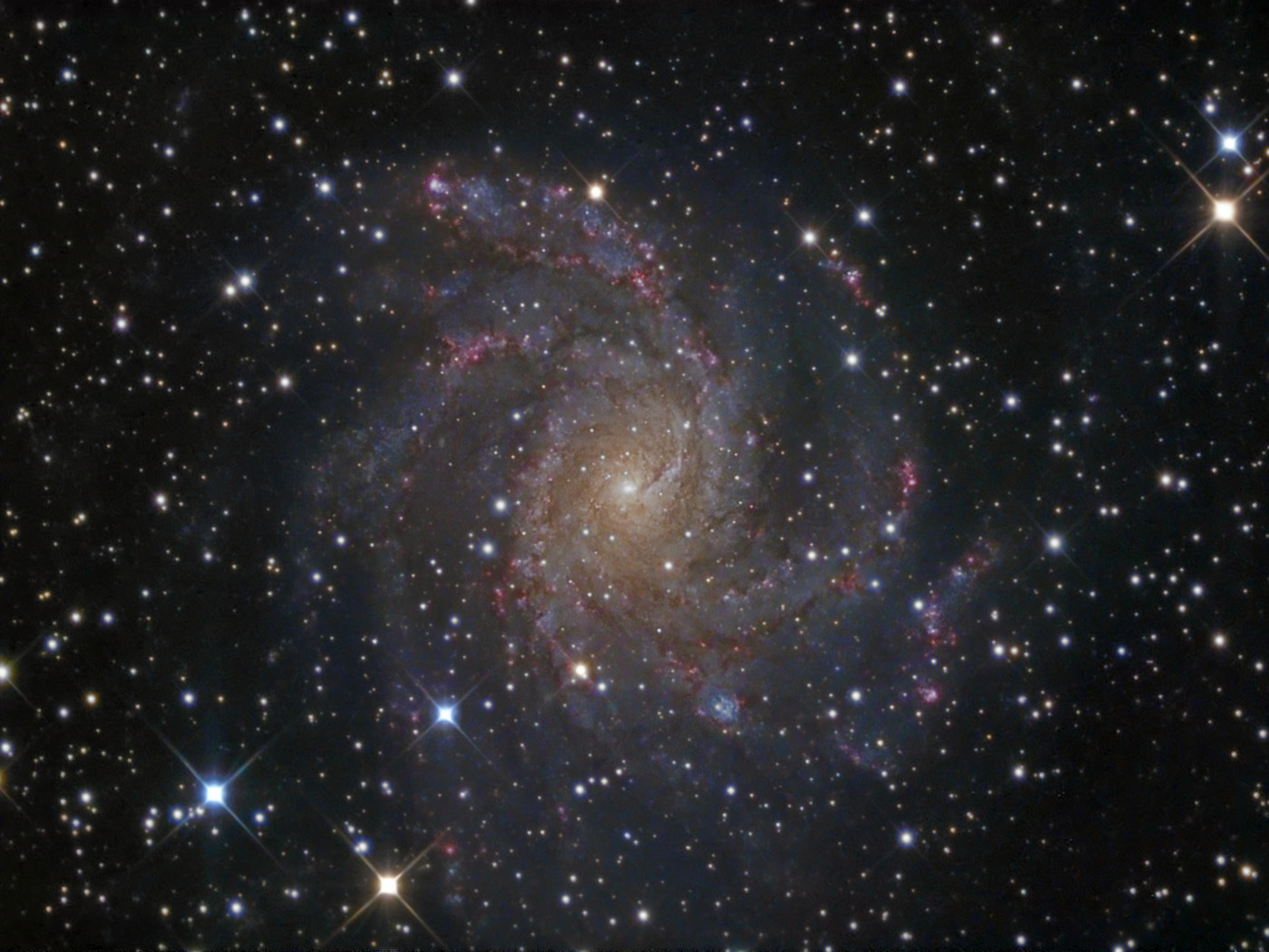Desde nuestra posición en la Galaxia de la Vía Láctea, vemos NGC 6946 de frente. Esta gran y hermosa galaxia espiral se encuentra a solo 10 millones de años luz de distancia, tras un velo de polvo y estrellas de primer plano en la constelación lejana y elevada de Cefeo. Desde el núcleo hacia el exterior, los colores de la galaxia cambian de la luz amarillenta de las estrellas antiguas en el centro a los jóvenes cúmulos de estrellas azules y las regiones de formación estelar rojizas a lo largo de los brazos espirales sueltos y fragmentados. NGC 6946 también es brillante en luz infrarroja y rica en gas y polvo, mostrando una alta tasa de nacimiento y muerte de estrellas. De hecho, desde principios del siglo XX, se han descubierto al menos nueve supernovas, las explosiones de muerte de estrellas masivas, en NGC 6946. En esta imagen compuesta de color profundo, una pequeña estructura barrada es apenas visible en el núcleo de la galaxia. Con casi 40.000 años luz de diámetro, NGC 6946 también es conocida como la Galaxia de los Fuegos Artificiales.