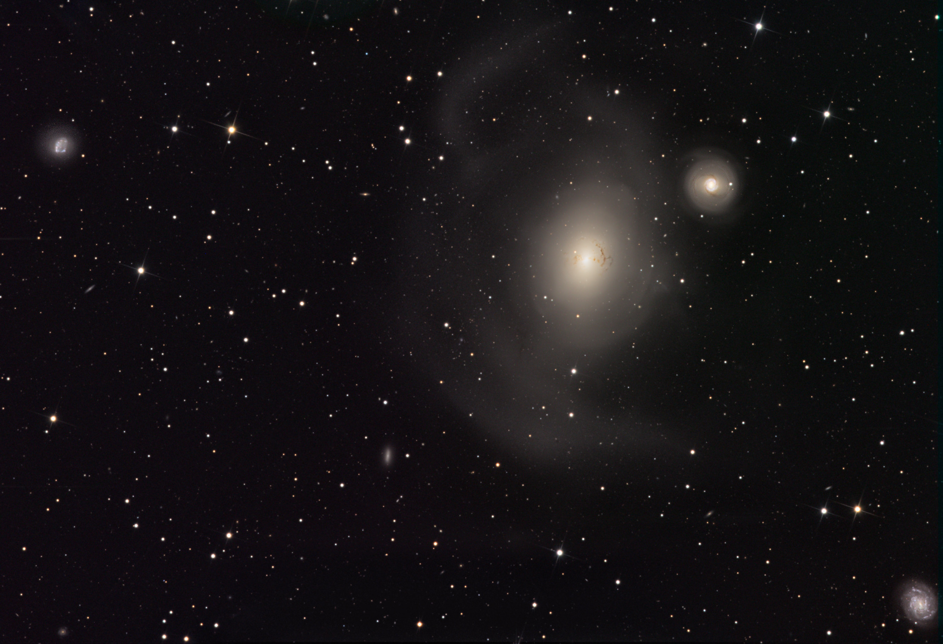 Los astrónomos actúan como detectives cuando intentan descifrar la causa de espectáculos sorprendentes como NGC 1316. Su investigación indica que NGC 1316 es una enorme galaxia elíptica que comenzó, hace aproximadamente 100 millones de años, a devorar a su vecina más pequeña, la galaxia espiral NGC 1317, justo encima de ella. La evidencia que apoya esta teoría incluye las oscuras bandas de polvo características de una galaxia espiral, y los remolinos tenues de estrellas y gas visibles en esta imagen amplia y profunda. Lo que permanece sin explicación son los cúmulos globulares de estrellas inusualmente pequeños, visibles como puntos tenues en la imagen. La mayoría de las galaxias elípticas tienen más y más brillantes cúmulos globulares que NGC 1316. Sin embargo, los globulares observados son demasiado antiguos para haber sido creados por la colisión espiral reciente. Una hipótesis es que estos globulares sobreviven de una galaxia aún más antigua que fue absorbida por NGC 1316.