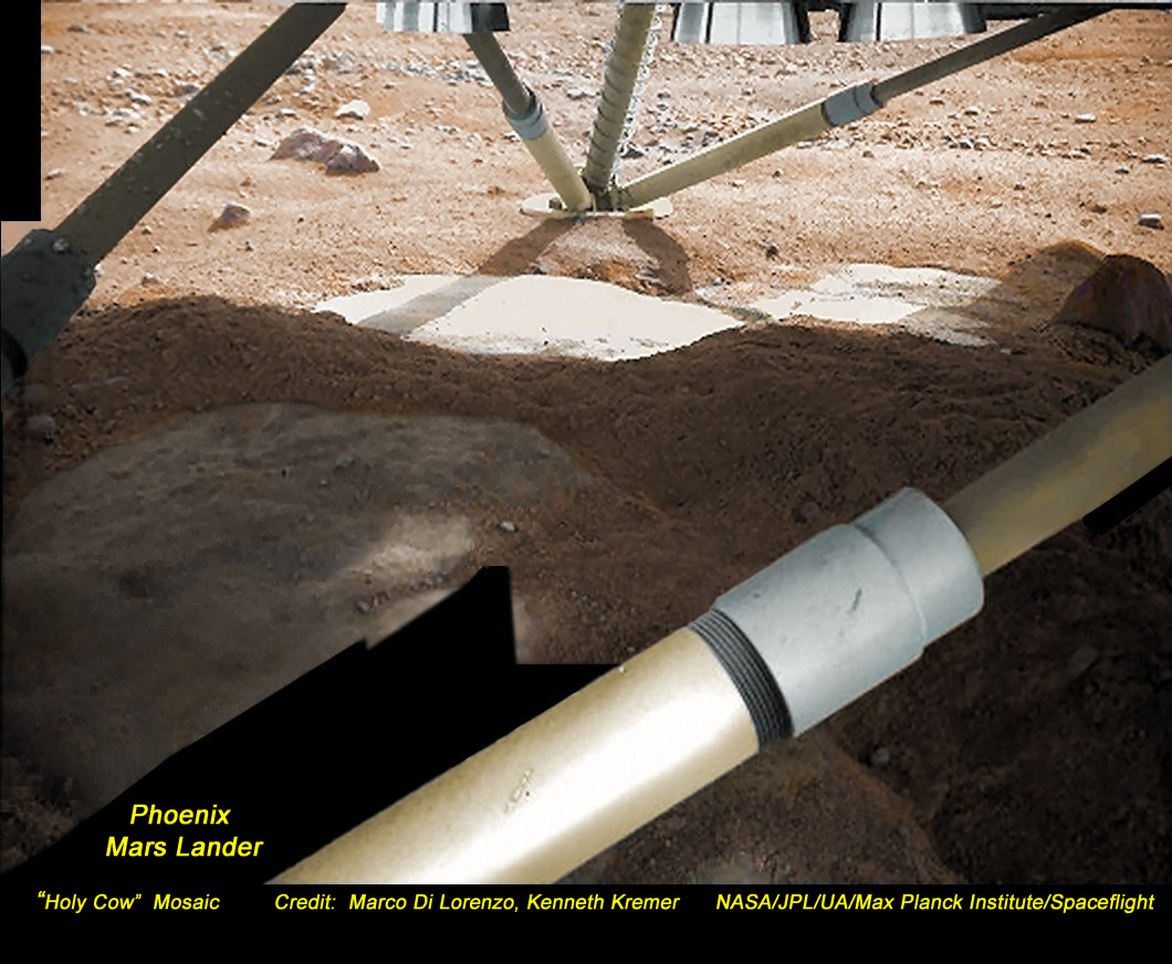 El verano marciano septentrional está llegando a su fin. Como se predijo, la disminución de las horas de luz diurna, el deterioro de las condiciones meteorológicas y las tormentas de polvo impidieron que los paneles solares del módulo de aterrizaje Phoenix Marte proporcionaran energía. La última señal de Phoenix se recibió el 2 de noviembre, con su misión exitosa terminando después de más de cinco meses en la región ártica del Planeta Rojo, un período que superó su vida operacional prevista. En su intento por descubrir si la superficie de Marte alguna vez ha podido albergar vida microbiana, Phoenix realizó un análisis exhaustivo del suelo y devolvió una gran cantidad de datos de imágenes. Por supuesto, uno de los resultados más emocionantes del módulo fue la detección de hielo de agua cerca de la superficie marciana. Registrada en octubre, esta imagen del Brazo Robótico de Phoenix muestra la región bajo el módulo con parches de hielo expuesto y plano. Esa área hizo que los investigadores exclamaran "¡Vaca Sagrada!" cuando fue fotografiada por primera vez unos días después del aterrizaje del Módulo de Aterrizaje Phoenix Marte el 25 de mayo.