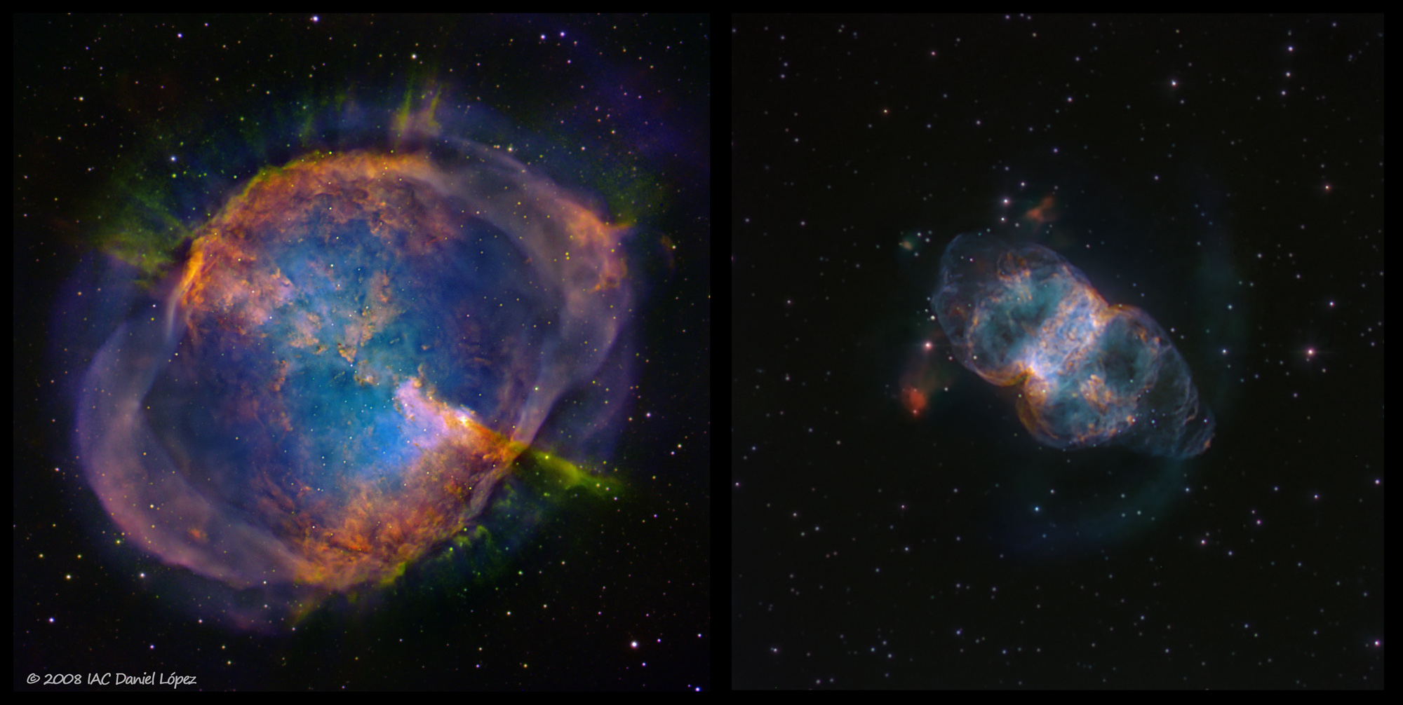 Estas dos nebulosas están catalogadas como M27 (izquierda) y M76, conocidas popularmente como La Mancuerna y la Pequeña Mancuerna. Sus nombres populares no pretenden indicar una capacidad intelectual deficiente, sino que se refieren a sus formas similares de mancuerna o reloj de arena. Ambas son nebulosas planetarias, envolturas gaseosas expulsadas por estrellas moribundas similares al Sol, y tienen un tamaño físico comparable, de alrededor de un año luz de diámetro. En cada panel, las imágenes fueron obtenidas a la misma escala, por lo que la diferencia de tamaño aparente se debe principalmente a que una está más cercana. Las estimaciones de distancia sugieren 1.200 años luz para la Mancuerna, comparado con 3.000 años luz o más para la Pequeña Mancuerna. Estas imágenes profundas, de banda estrecha y en falso color, revelan algunas estructuras notablemente complejas en M27 y M76, destacando la emisión de átomos de hidrógeno, nitrógeno y oxígeno dentro de estas nubes cósmicas.