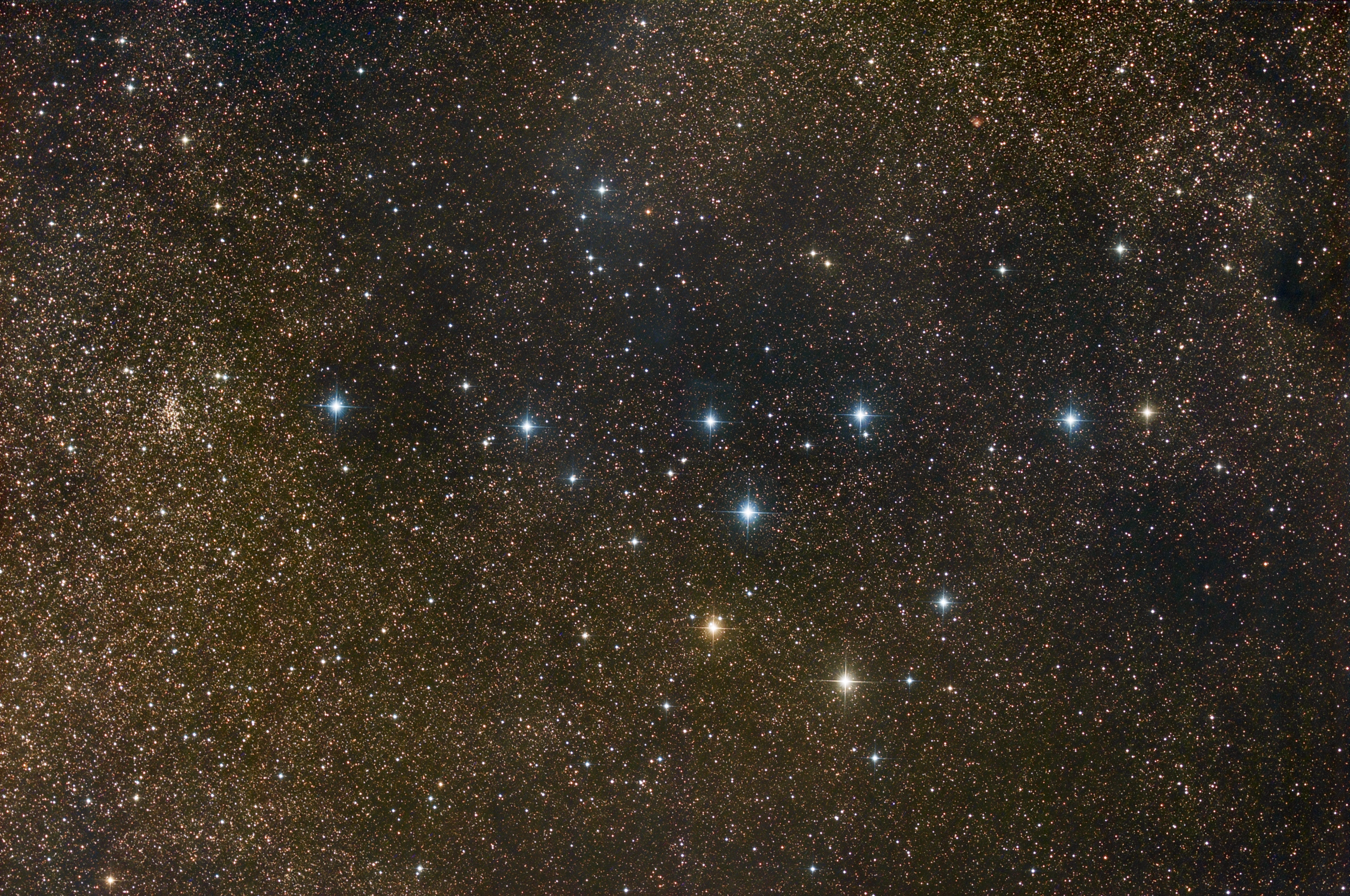 ¿Es este perchero un cúmulo de estrellas o un asterismo? Este enigma cósmico ha sido debatido durante gran parte del siglo pasado, mientras que los astrónomos se preguntaban si este objeto visible con binoculares es realmente un cúmulo abierto físicamente asociado o una proyección accidental. Las proyecciones accidentales de estrellas se conocen como asterismos, un ejemplo de los cuales es la popular Gran Osa. Mediciones precisas recientes desde diferentes puntos de vista en la órbita terrestre alrededor del Sol han revelado discrepancias en los desplazamientos angulares que indican que el Perchero se describe mejor como un asterismo. Conocido más formalmente como Collinder 399, este brillante agrupamiento estelar es más amplio que la luna llena y se encuentra en la constelación del Zorro (Vulpecula). En el extremo derecho de la imagen se encuentra el cúmulo abierto de estrellas NGC 6802.