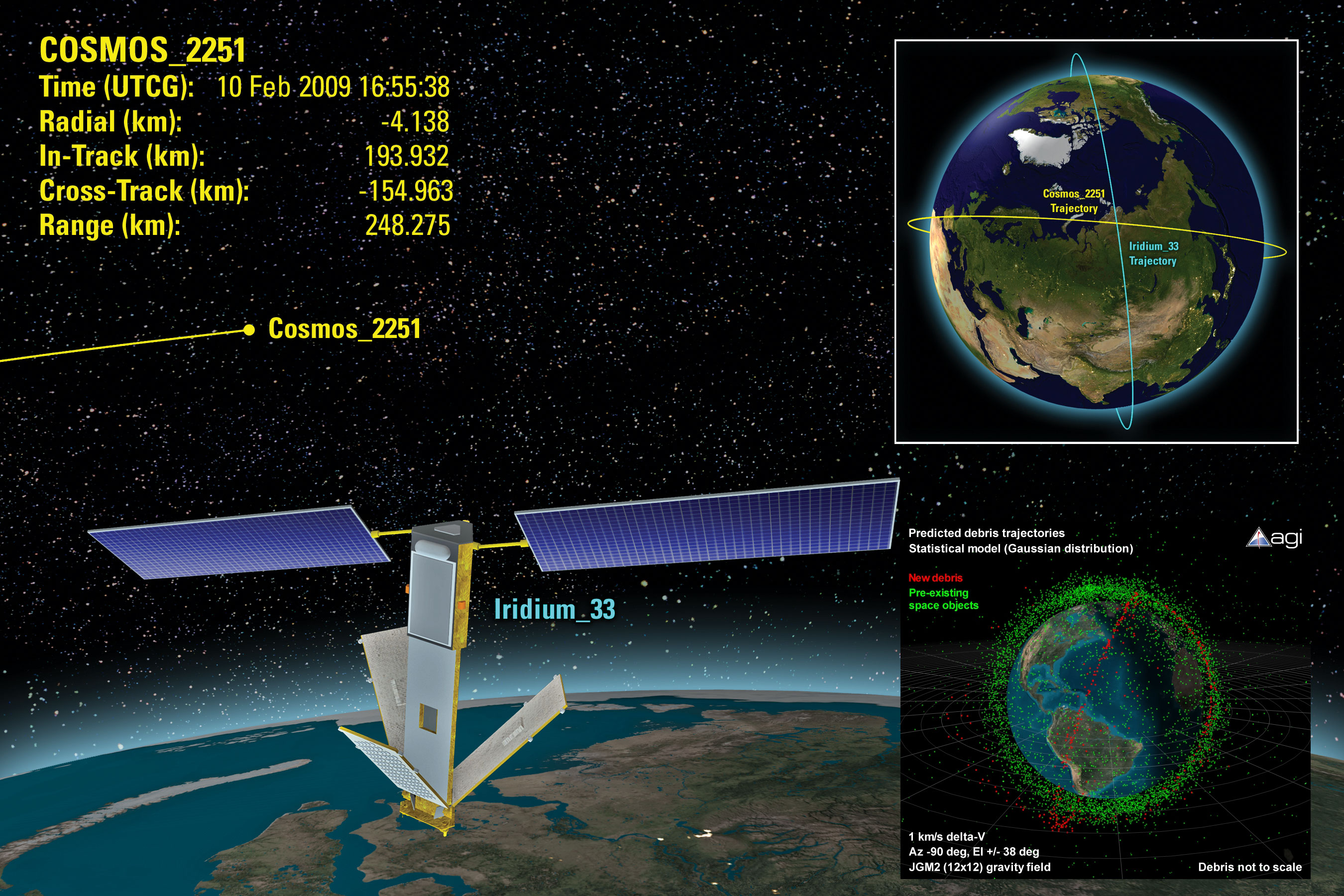 ¿Con qué frecuencia colisionan los satélites? Aunque fragmentos minúsculos de escombros espaciales pueden impactar ocasionalmente cualquier satélite, la primera colisión conocida entre dos satélites completos ocurrió apenas la semana pasada. A pesar de que se han lanzado miles de satélites, la baja tasa de colisiones se debe a la vastedad del espacio. Sin embargo, la semana pasada, un satélite ruso de comunicaciones inoperativo denominado Cosmos 2251 impactó directamente contra un satélite operativo de comunicaciones estadounidense llamado Iridium 33 sobre Siberia, Rusia. Ambos satélites fueron destruidos. La gran cantidad de partículas masivas en una nube de escombros dispersándose, mostrada en una imagen insertada arriba, aumenta el riesgo de que otros satélites en operación puedan ser golpeados por un proyectil de rápido movimiento y dañino. La colisión ocurrió en órbita terrestre baja a solo 750 kilómetros de altura, una altitud compartida por muchos satélites pero significativamente más alta que la Estación Espacial Internacional ocupada por humanos, que orbita a 350 km de altura. Dado que los satélites pueden desintegrarse cuando son golpeados por basura espacial de rápido movimiento, el choque enfoca la preocupación de que una futura colisión espectacular de satélites pueda algún día iniciar una cascada de ablación de colisiones cada vez más numerosas. El resultado podría entonces hacer que los vuelos espaciales humanos futuros sean cada vez más arriesgados y que las vidas útiles de los satélites sean cada vez más breves.