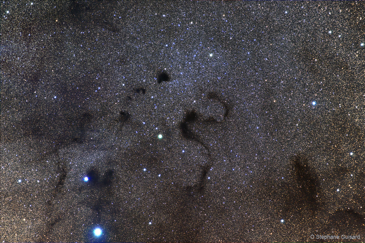 Nebulosas oscuras serpentean a través de una magnífica extensión de estrellas en esta vista telescópica hacia la constelación pronunciable Ofiuco y el centro de nuestra Galaxia Vía Láctea. De hecho, la forma central retorcida que se ve aquí es bien conocida como la Nebulosa Serpiente. También figura como Barnard 72 (B72), uno de los 182 marcajes oscuros del cielo catalogados a principios del siglo XX por el astrónomo E. E. Barnard. A diferencia de las nebulosas de emisión brillante y los cúmulos estelares, las nebulosas de Barnard son nubes interestelares oscuras de gas y polvo que obscurecen la vista. Sus formas son visibles en silueta cósmica porque se encuentran en primer plano a lo largo de la línea de visión hacia campos estelares ricos y viveros estelares incandescentes cerca del plano de nuestra Galaxia. Muchas de las nebulosas oscuras de Barnard son en sí mismos probables lugares de formación estelar futura. Barnard 72 se encuentra aproximadamente a 650 años luz de distancia. Con la estrella azulada 44 Ofiuco en la parte inferior izquierda, el intrigante campo estelar abarca casi 2 grados o casi 20 años luz a la distancia estimada de la Nebulosa Serpiente.