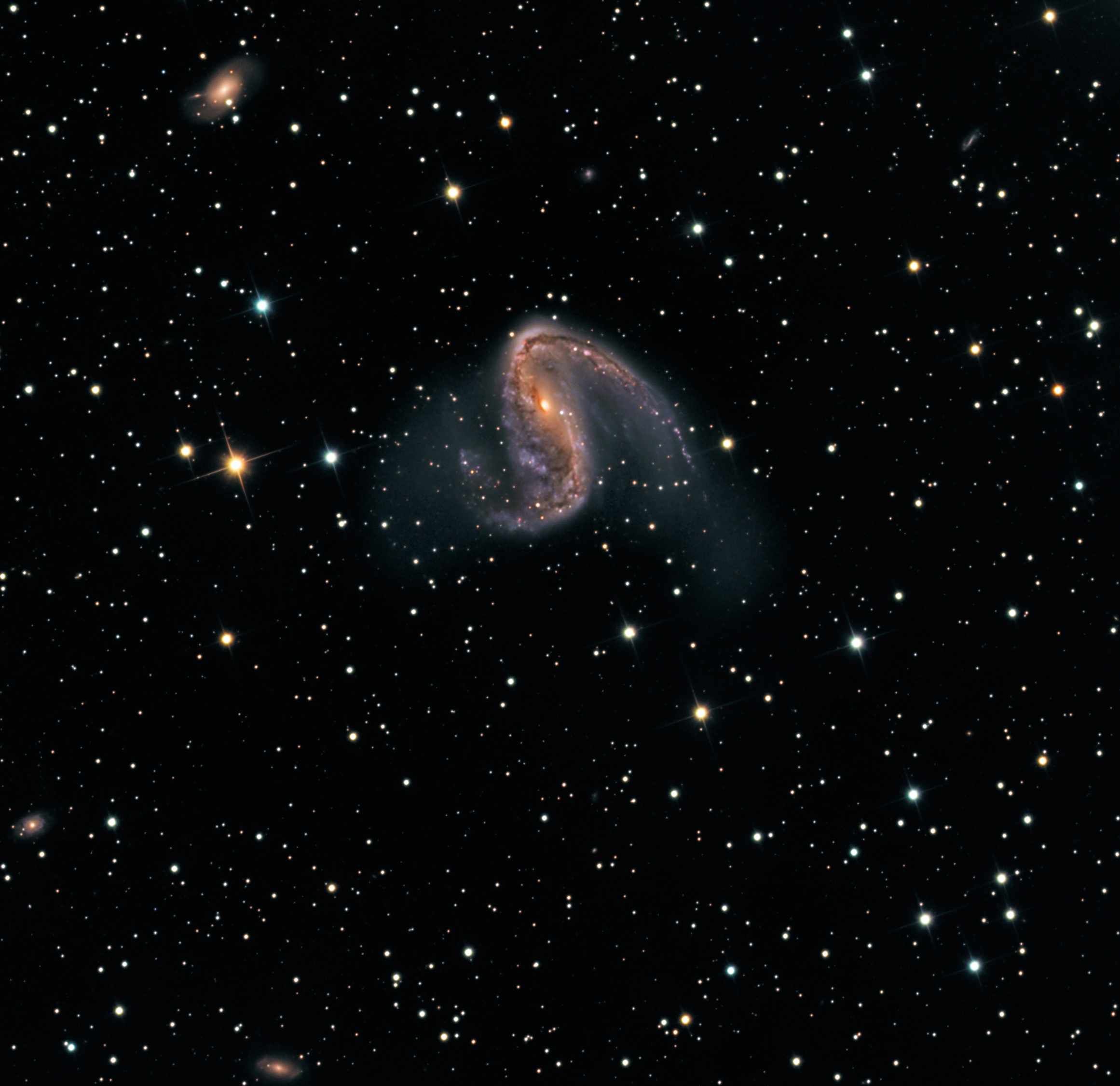 La galaxia distorsionada NGC 2442 se encuentra en la constelación austral del pez volador, Volans. Ubicada a unos 50 millones de años luz de distancia, los dos brazos espirales de la galaxia que se extienden desde una barra central pronunciada le dan una apariencia en forma de gancho. Esta imagen en color profundo también muestra las vías oscuras de polvo que oscurecen los brazos, los jóvenes cúmulos de estrellas azules y las regiones de formación estelar de color rojizo que rodean un núcleo de luz amarillenta producida por una población más antigua de estrellas. Sin embargo, las regiones de formación estelar parecen estar más concentradas a lo largo del brazo espiral alargado (lado derecho). La estructura distorsionada probablemente sea el resultado de un encuentro cercano antiguo con la galaxia más pequeña que se ve cerca de la parte superior izquierda de este campo de visión. Las dos galaxias interactivas están separadas por unos 150 000 años luz a la distancia estimada de NGC 2442.