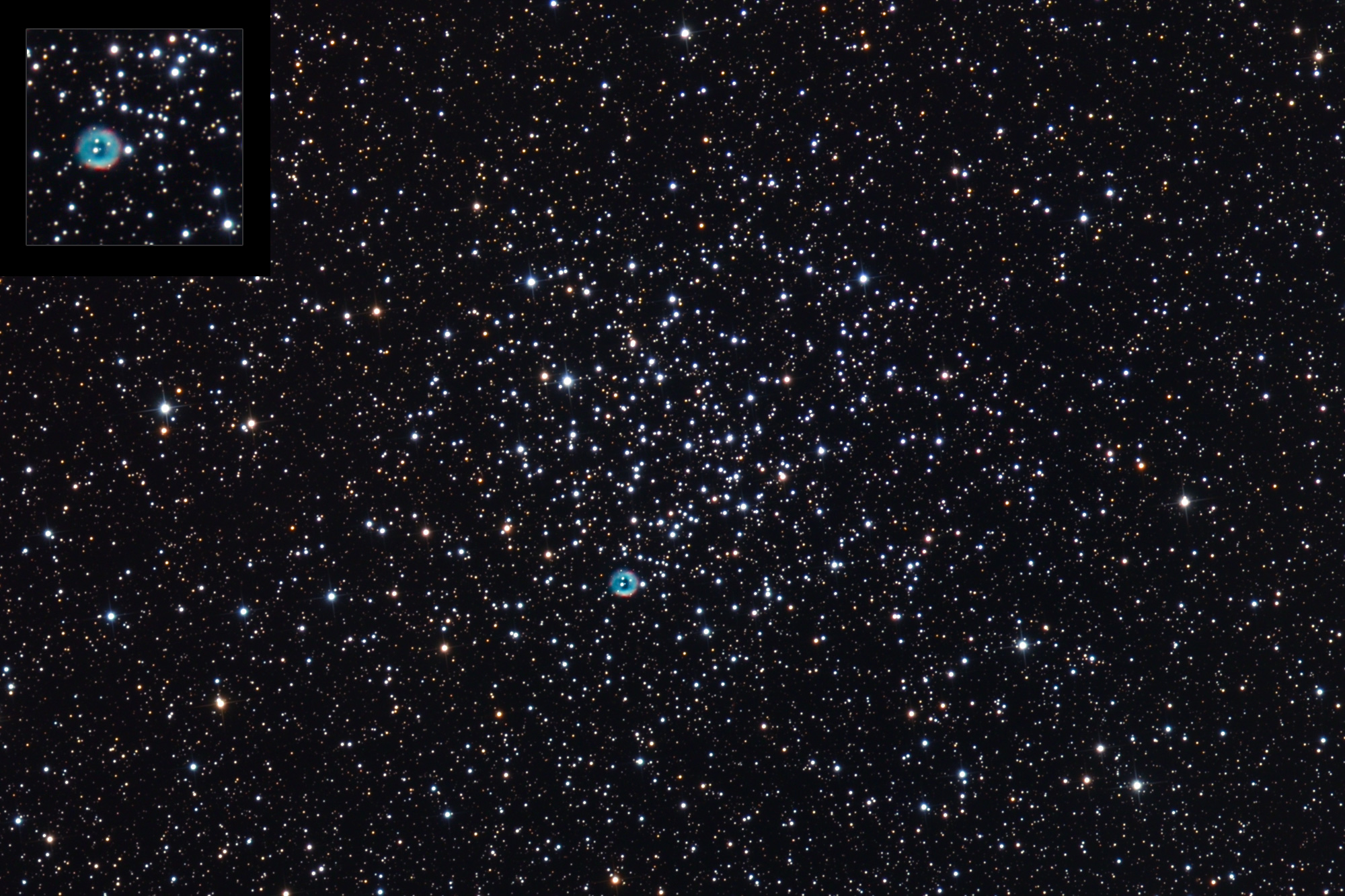 Los cúmulos estelares galácticos u abiertos son relativamente jóvenes. Estos enjambres de estrellas nacen cerca del plano de la Vía Láctea, pero su número disminuye progresivamente a medida que los miembros del cúmulo se dispersan por la Galaxia debido a interacciones gravitacionales. Este brillante cúmulo abierto, conocido como M46, tiene aproximadamente 300 millones de años y aún contiene cientos de estrellas dentro de su extensión de unos 30 años luz. Ubicado a unos 5,000 años luz de distancia en dirección a la constelación de Popa, M46 también parece contener una contradicción a su estado juvenil. En la hermosa escena estelar, el parche colorido y circular justo debajo del centro de M46 (también insertado en la esquina superior izquierda) es la nebulosa planetaria NGC 2438. Las nebulosas planetarias son una fase breve y final en la vida de una estrella tipo solar de unos pocos miles de millones de años, cuyo suministro central de combustible de hidrógeno se ha agotado. De hecho, la antigua NGC 2438 se estima que se encuentra a solo 3,000 años luz de distancia y se mueve a una velocidad diferente a la de los miembros del cúmulo M46. Probablemente representa un objeto del primer plano, que aparece por casualidad a lo largo de nuestra línea de visión hacia el joven M46.