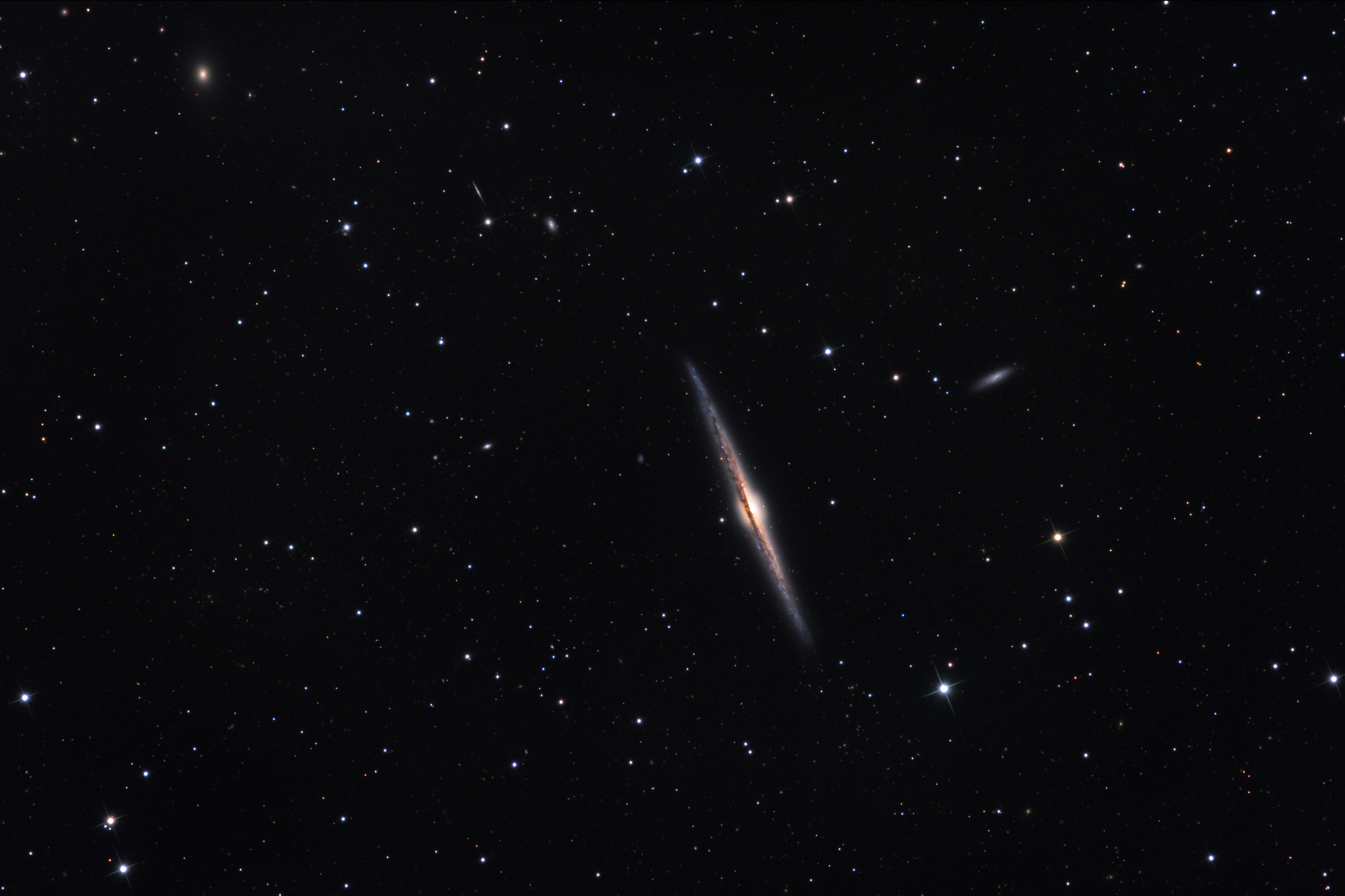 Is our Galaxy this thin? We believe so. Magnificent spiral galaxy NGC 4565 is likely similar to our own spiral galaxy, but viewed edge-on from far away. Also known as the Needle Galaxy for its narrow profile, bright NGC 4565 is a stop on many telescopic tours of the northern sky as it lies in the faint but well-groomed constellation Coma Berenices. This sharp color image reveals the galaxy's bulging central core dominated by light from a population of older, yellowish stars. The core is dramatically cut by obscuring dust lanes which lace NGC 4565's thin galactic plane. NGC 4565 lies about 30 million light-years distant and spans over 100,000 light-years in diameter. Visible through a small telescope, some sky enthusiasts consider NGC 4565 to be a prominent celestial masterpiece Messier missed.