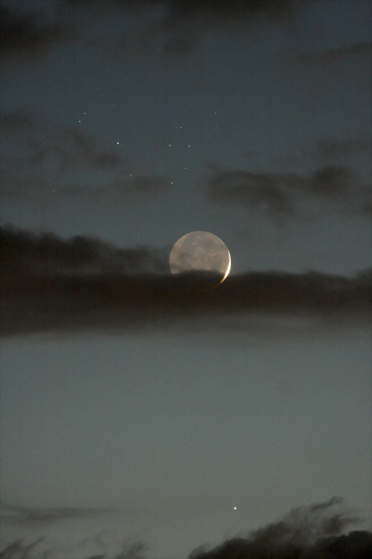 Last Sunday's fading evening twilight featured a young crescent Moon along the western horizon. The young Moon also shared the sky with the lovely Pleiades star cluster and wandering planet Mercury. Framed by clouds in this serene skyscape from Selsey, UK, a similar twilight scene was visible around the globe. Emerging from the cloud bank below the Pleiades, the narrow sunlit lunar crescent is overexposed. Still, the Moon's dim night side is impressively clear, illuminated by earthshine. Bright, innermost planet Mercury lies near the bottom of the field. Mercury will remain near the Pleiades, low in the west after sunset over the coming days, an ongoing conjunction of planet and star cluster that will offer skygazers some excellent binocular views.