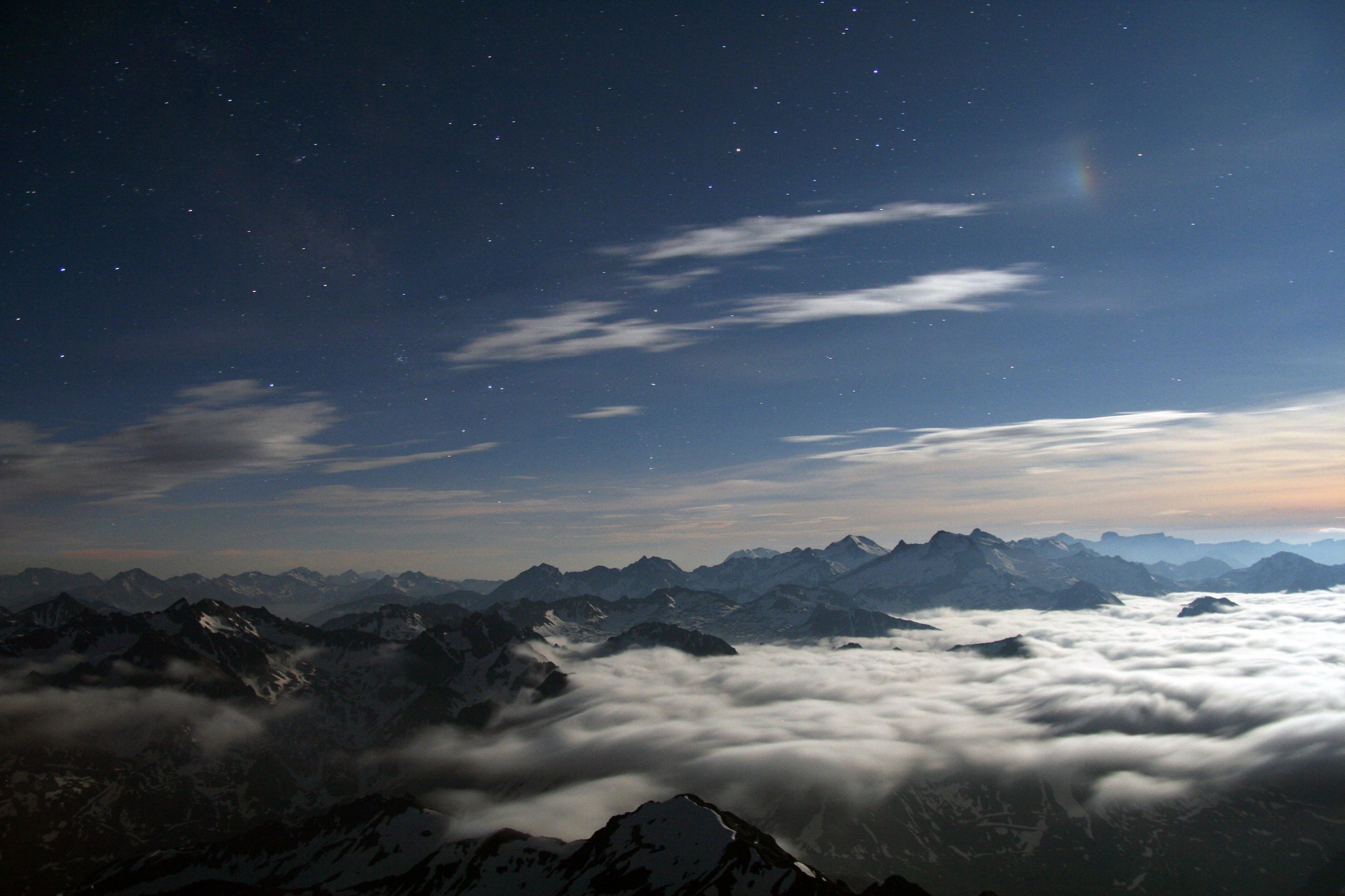 A sea of clouds laps at rugged mountain peaks of the French Pyrenees in this serene view from Pic du Midi Observatory. The time exposure was recorded on June 4, with the constellations Sagittarius and Scorpius shining in the starry night. At the top right lies a faint, but colorful moondog or paraselene. Analogous to a sundog or parhelion, the paraselene is produced by moonlight shining through thin, hexagonal-shaped ice crystals in high cirrus clouds. As determined by the ice crystal geometry, a bright gibbous Moon illuminates the scene from beyond the picture's right edge, 22 degrees from the lovely paraselene.