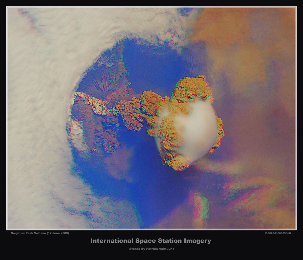 Desde una altura de 400 kilómetros sobre la Tierra, la tripulación de la Expedición 20 a bordo de la Estación Espacial Internacional (ISS) pudo presenciar un evento notable desde una perspectiva inusual: la erupción del volcán Sarychev Peak el 12 de junio. El volcán activo se encuentra en la cadena de islas Kuril de Rusia, que se extiende al noreste de Japón. Para resaltar la perspectiva orbital, esta impresionante vista en color en estereoscopía fue creada combinando dos imágenes tomadas desde la ISS y está diseñada para ser observada con gafas rojo/azul (rojo para el ojo izquierdo). En una etapa temprana de la erupción, la columna de humo volcánica se eleva hacia la atmósfera, mostrando una columna marrón de ceniza coronada por una nube blanca suave y burbujeante, probablemente formada por condensación de agua. Debajo, una nube de ceniza más densa y de color gris desciende por la ladera volcánica. A nivel del suelo, se puede ver aproximadamente 1.5 kilómetros de la costa de la isla. La nube de ceniza en evolución no representó peligro para la tripulación de la Expedición 20, pero los vuelos comerciales fueron desviados de la región para minimizar el riesgo de fallos en los motores causados por la ingestión de ceniza volcánica.