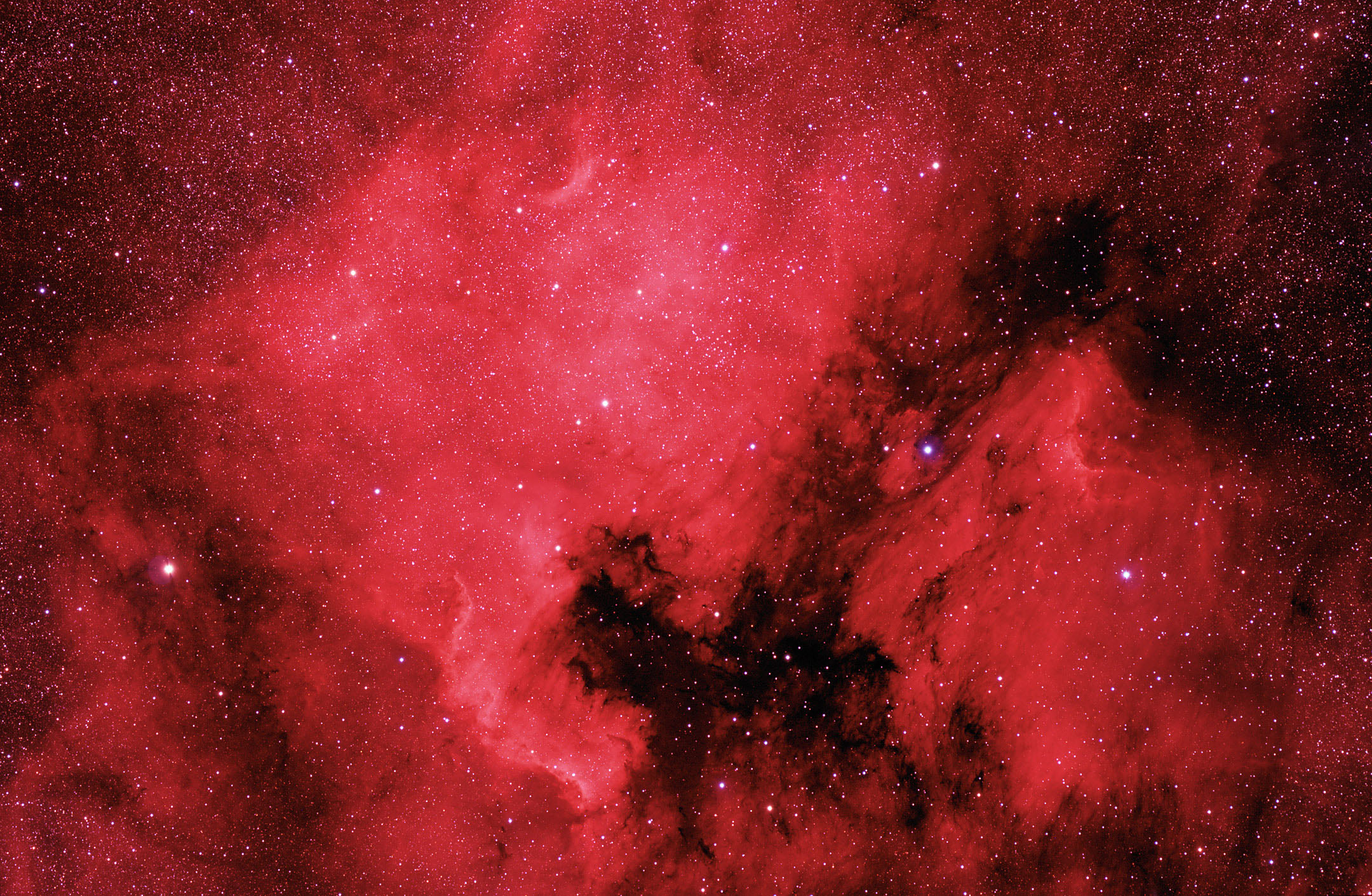 Here are some familiar shapes in unfamiliar locations. This emission nebula on the left is famous partly because it resembles Earth's continent of North America. To the right of the North America Nebula, cataloged as NGC 7000, is a less luminous nebula that resembles a pelican dubbed the Pelican Nebula. The two emission nebula measure about 50 light-years across, are located about 1,500 light-years away, and are separated by a dark absorption cloud. This spectacular image captures the nebulas, bright ionization fronts, and fine details of the dark dust. The nebulae can be seen with binoculars from a dark location. Look for a small nebular patch north-east of bright star Deneb in the constellation of Cygnus. It is still unknown which star or stars ionize the red-glowing hydrogen gas.