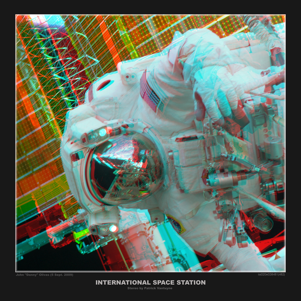 Saca tus gafas rojas/azules e inspecciona esta imagen de cerca del astronauta de NASA John Olivas, con traje espacial, fuera de la Estación Espacial Internacional. Cuidadosamente construida a partir de dos fotografías (ISS020-E-038481, ISS02-0E-038482) tomadas durante la última visita del transbordador espacial Discovery a la base orbital, el anaglifo en 3D crea la convincente ilusión de que puedes realmente alargar la mano y tomar su guante. El fotógrafo, el astronauta de la ESA Christer Fuglesang, junto con las estructuras de la ISS y el horizonte de la Tierra, aparecen reflejados en el casco de Olivas. El viernes pasado, los dos regresaron a la Tierra junto con el resto de la tripulación de Discovery, aterrizando en la base de la Fuerza Aérea de Edwards en California.