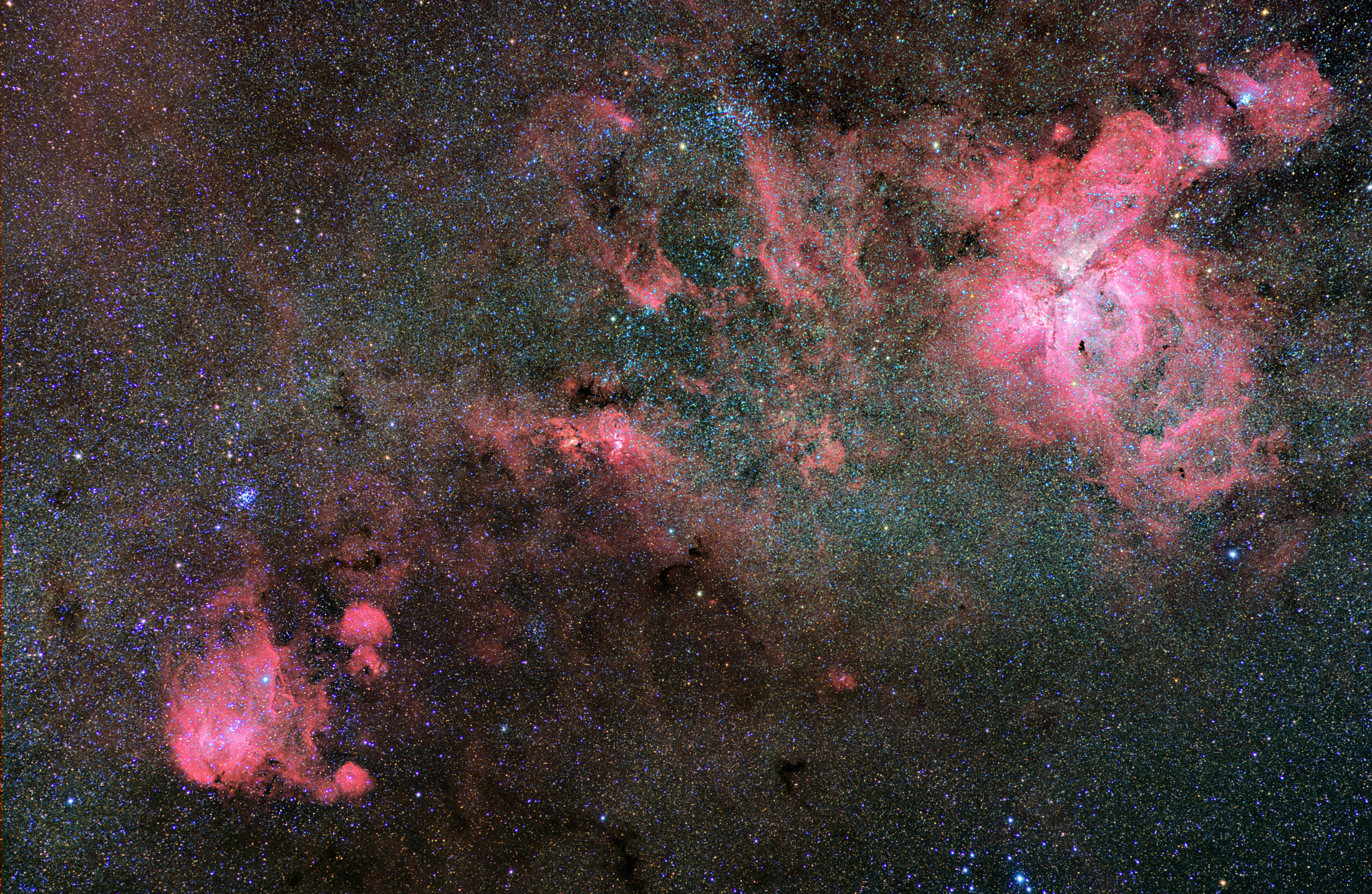 Una joya del cielo sur, la Gran Nebulosa de Carina, también conocida como NGC 3372, abarca más de 300 años luz. Cerca de la parte superior derecha de esta amplia escena celeste, es mucho más grande que la más septentrional Nebulosa de Orión. De hecho, la Nebulosa de Carina es una de las regiones más grandes de formación estelar de nuestra galaxia y alberga estrellas jóvenes y extremadamente masivas, incluyendo la aún enigmática estrella variable Eta Carinae, una estrella con más de 100 veces la masa del Sol. Entre las nebulosas cercanas al centro del campo de 10 grados de ancho se encuentran NGC 3576 y NGC 3603. En la parte superior central del marco se encuentra el cúmulo estelar abierto NGC 3532, el Cúmulo del Pozo de los Deseos. Más compacto, NGC 3766, el Cúmulo de las Perlas, puede verse a la izquierda. En la esquina inferior izquierda del lienzo cósmico se ancla otra gran región de formación estelar, IC 2948/2944 con el cúmulo estelar incrustado Collinder 249. Esa región es popularmente conocida como la Nebulosa del Pollo Corredor.