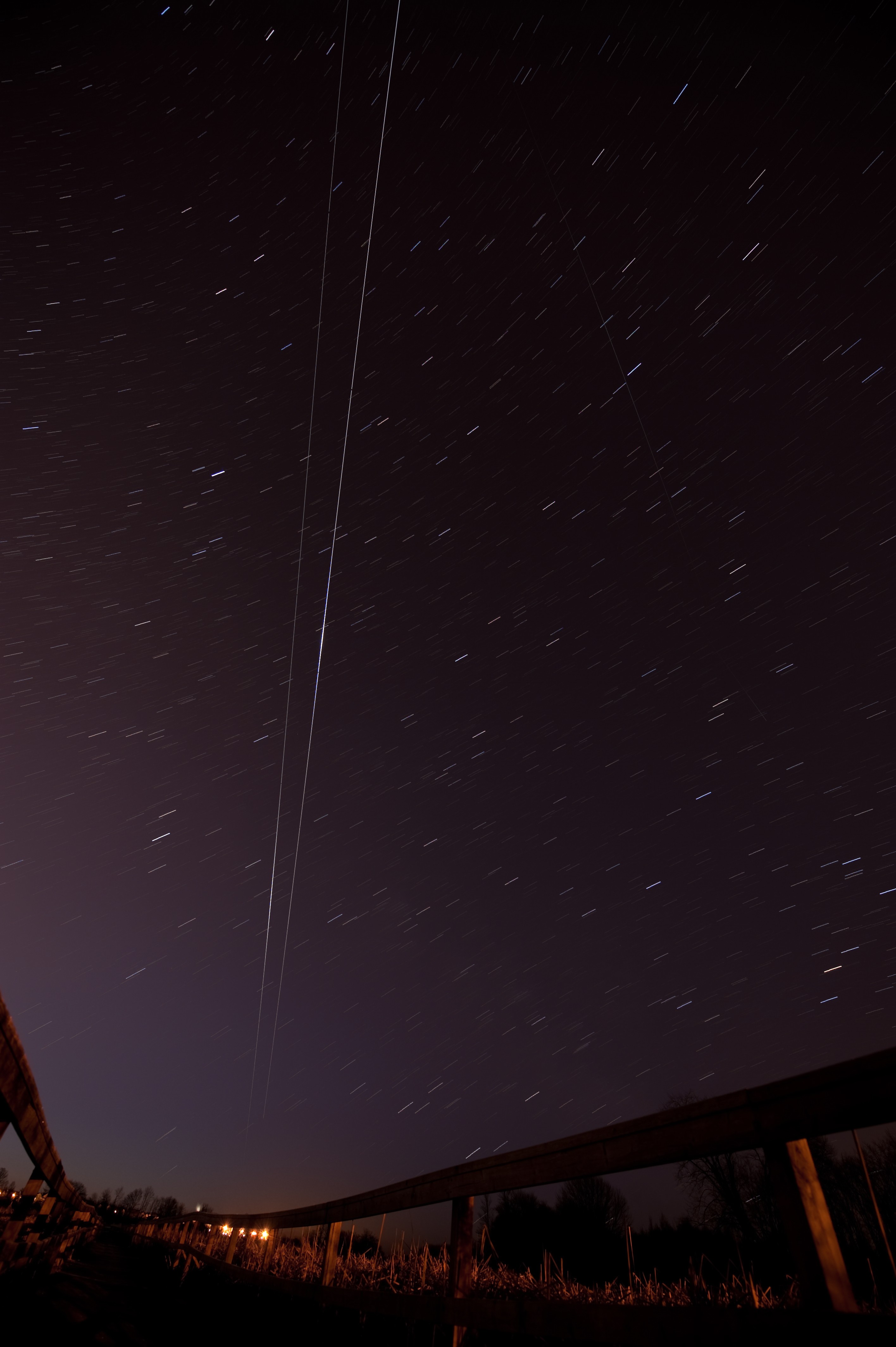 El 21 de febrero, el transbordador espacial Endeavour y la Estación Espacial Internacional (ISS) volaron por el cielo cerca del amanecer sobre Whitby, Ontario, Canadá. Junto con las trayectorias estelares, ambos fueron capturados en esta única exposición de tiempo. Brillando a la luz del sol a 350 kilómetros sobre la Tierra, Endeavour precedió ligeramente a la ISS al arquearse sobre el horizonte. Pero la trayectoria más brillante y el destello más brillante pertenecen a la estación espacial recientemente visitada por Endeavour. Cerca del final de la misión STS-130, horas más tarde Endeavour realizó un aterrizaje nocturno en el Centro Espacial Kennedy.