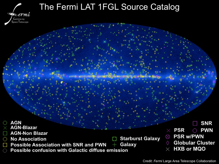 What shines in the gamma-ray sky? The most complete answer yet to that question is offered by the Fermi Gamma-ray Space Telescope's first all-sky catalog. Fermi's sources of cosmic gamma-rays feature nature's most energetic particle accelerators, ultimately producing 100 MeV to 100 GeV photons, photons with more than 50 million to 50 billion times the energy of visible light. Distilled from 11 months of sky survey data using Fermi's Large Area Telescope (LAT), the 1,451 cataloged sources include energetic star burst galaxies and active galactic nuclei (AGN) far beyond the Milky Way. But within our own galaxy are many pulsars (PSR) and pulsar wind nebulae (PWN), supernova remnants (SNR), x-ray binary stars (HXB) and micro-quasars (MQO). Fermi's all sky map is shown centered on the Milky Way with the diffuse gamma-ray emission from the Galactic plane running horizontally through the frame. To locate the cataloged gamma-ray sources, just slide your cursor over the map. For now, 630 of the sources cataloged at gamma-ray energies remain otherwise unidentified, not associated with sources detected at lower energies.