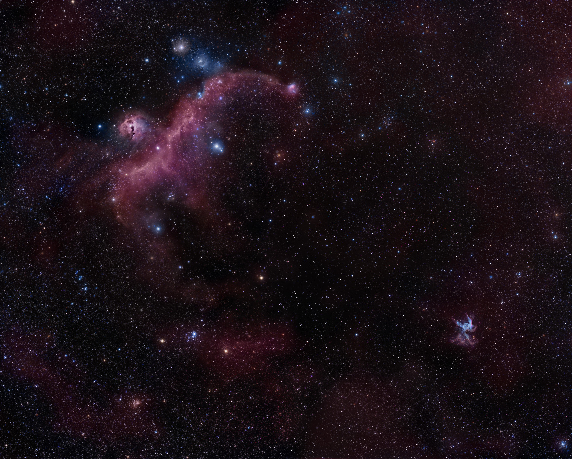 Seen as a seagull and a duck, these nebulae are not the only cosmic clouds to evoke images of flight. But both are winging their way across this broad celestial landscape, spanning almost 7 degrees across planet Earth's night sky toward the constellation Canis Major. The expansive Seagull (upper left) is itself composed of two major cataloged emission nebulae. Brighter NGC 2327 forms the head with the more diffuse IC 2177 as the wings and body. Impressively, the Seagull's wingspan would correspond to about 250 light-years at an estimated distance of 3,800 light-years. At the lower right, the Duck appears much more compact and would span only about 50 light-years given its 15,000 light-year distance estimate. Blown by energetic winds from an extremely massive, hot star near its center, the Duck nebula is cataloged as NGC 2359. Of course, the Duck's thick body and winged appendages also lend it a more dramatic popular moniker -- Thor's Helmet.